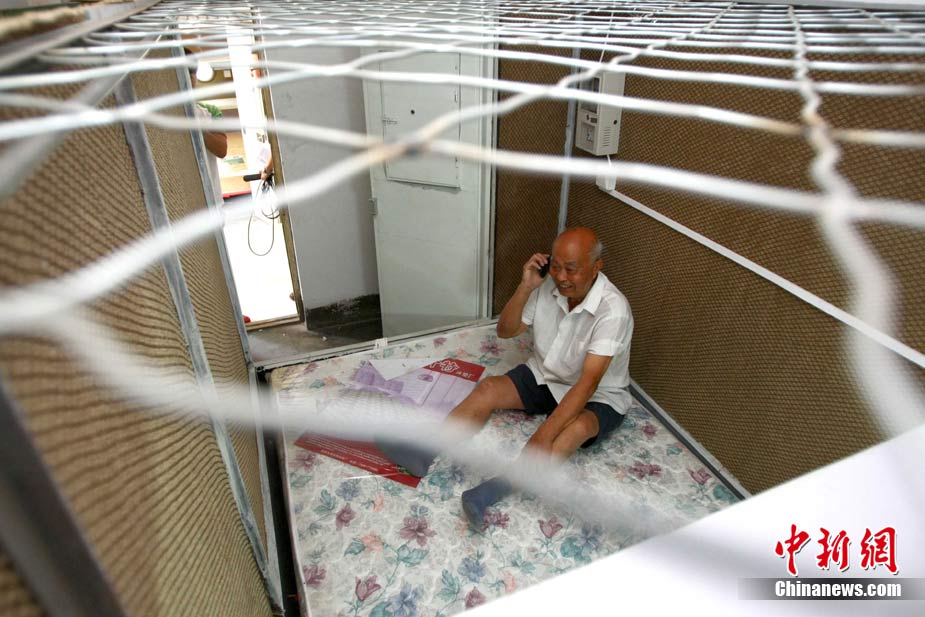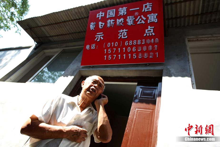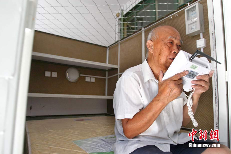8月16日,在北京石景山區麻峪東街,78歲老人黃日新所建的第三代膠囊公寓開張。第三代膠囊公寓設有單人間和夫妻間(圖),大小為長2.4米、寬1.2米(夫妻房寬1.6米)、高2米。每個膠囊房間采用席夢思床墊,在電腦桌上方安置床頭柜,安裝獨立電表,并增設廚房和廁所。中新社發 富田 攝
