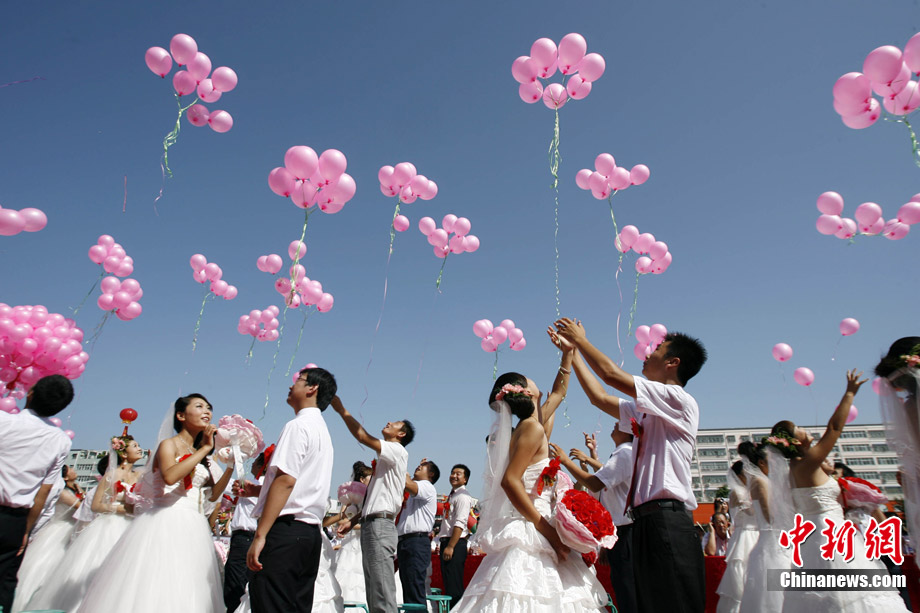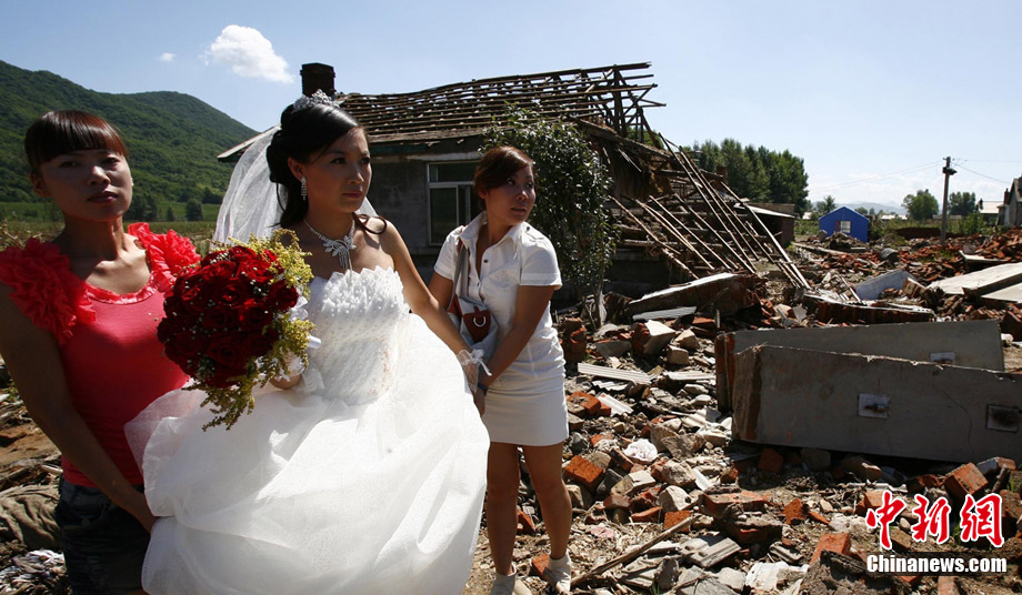 8月16日,吉林市前二道鄉“災區新娘”劉旭穎在藍色的救災帳篷里出嫁。27歲的劉旭穎本應在7月30日結婚,然而7月28日凌晨的一場罕見洪水將她家所在的村莊變成一片廢墟,也沖走了準新娘的婚禮。為了圓自己一個心愿,也為了讓災區人看到生活的希望,劉旭穎決定辦一場特別的災區婚禮。中新社發 蒼雁 攝