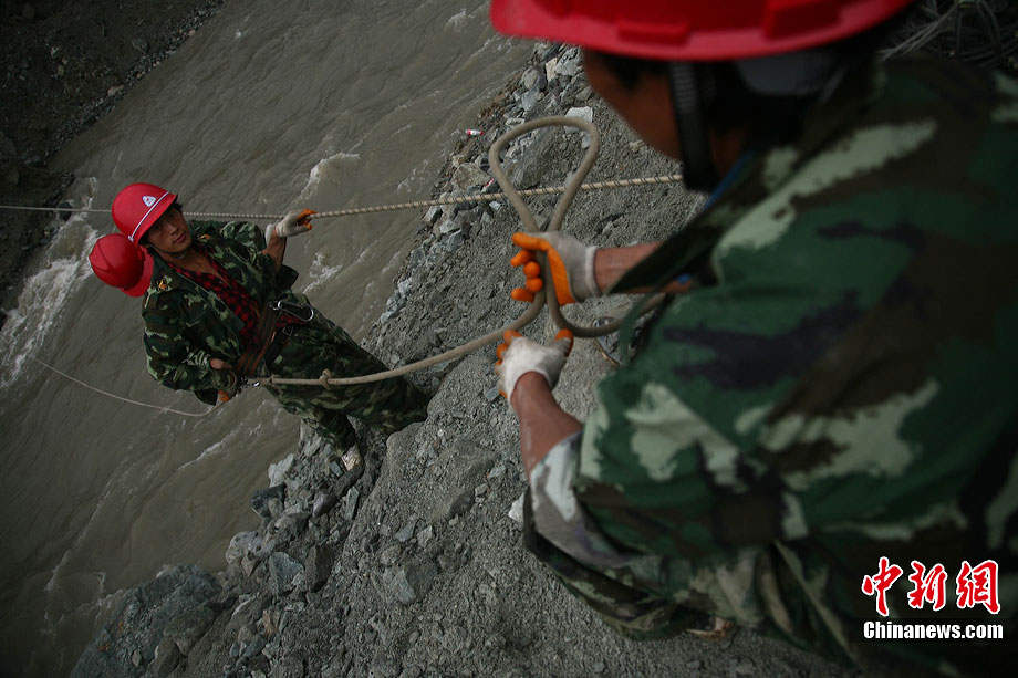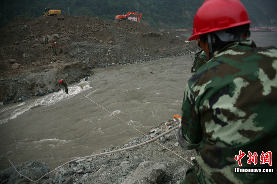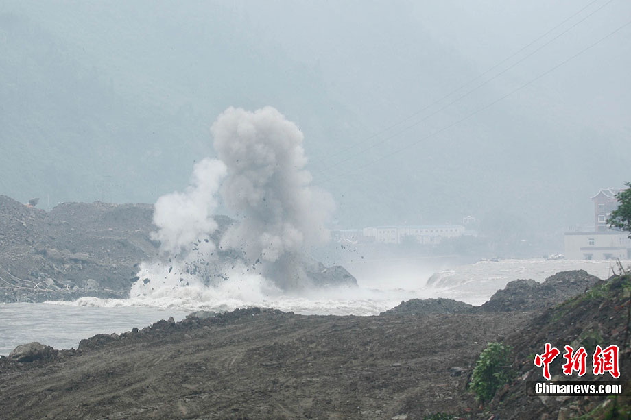 8月17日下午,映秀泥石流搶險(xiǎn)救災(zāi)指揮部對(duì)致使岷江改道的堰塞體進(jìn)行了第二次爆破,由于天氣不甚理想,為了盡快實(shí)現(xiàn)岷江河水“回軌”,救援指揮部決定以爆破的方式加快搶險(xiǎn)進(jìn)度。據(jù)爆破現(xiàn)場(chǎng)負(fù)責(zé)人透露,此次爆破主要是為解決8塊巨石,這些巨石超出了挖掘機(jī)的負(fù)荷量,必須選擇爆破方式解決。中新社發(fā) 張浪 攝