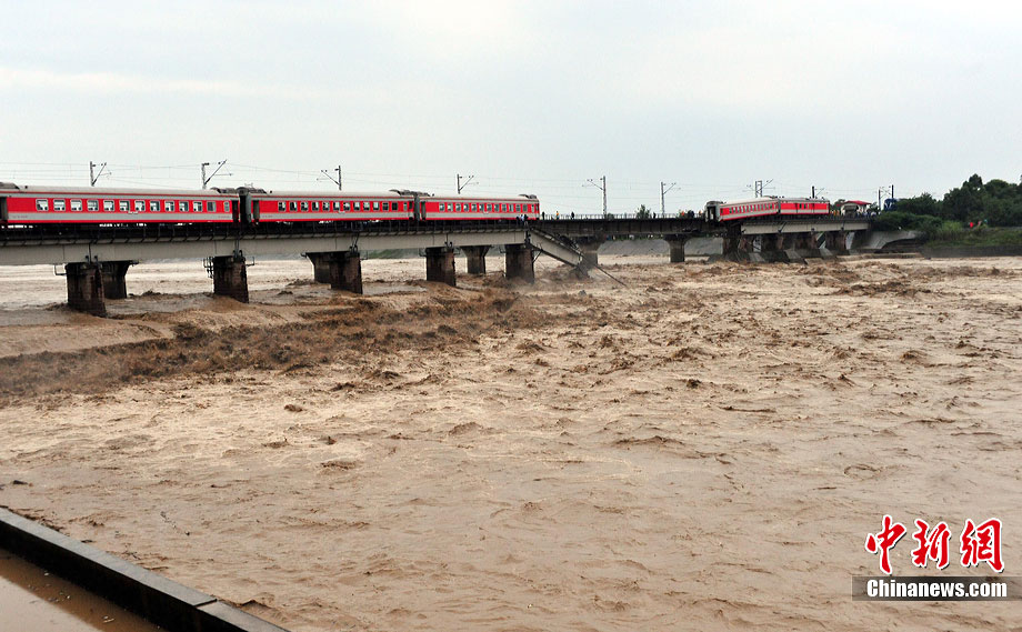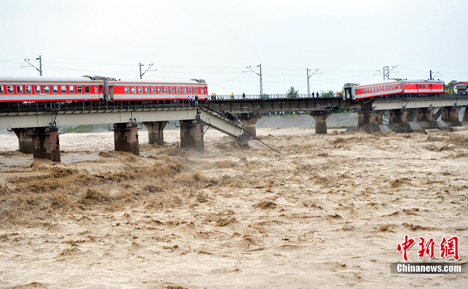 中新網成都8月19日電(楊杰 周迪迪 田甜)19日下午15時20分,從西安開往昆明的K165次列車兩節車廂在四川廣漢市境內掉進石亭江,被洪水沖出200米遠。經過緊張的營救,車上人員已全部安全轉移,未出現人員傷亡。安源 攝
