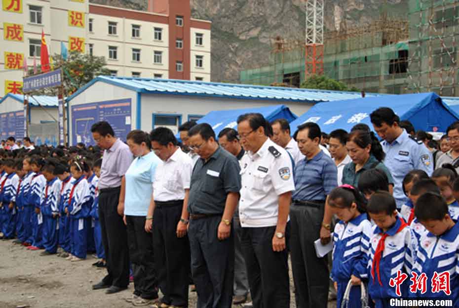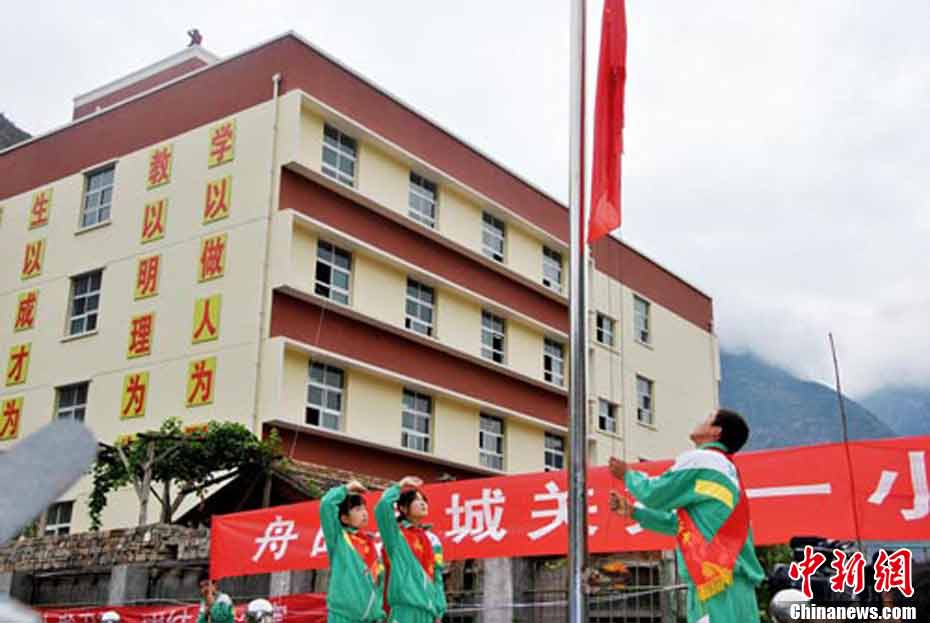 8月25日,舟曲小學(xué)生迎來新學(xué)期的第一天。圖為當(dāng)日上午城關(guān)一小舉行升國(guó)旗儀式。馬曉俊 攝