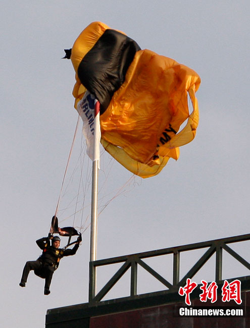 當地時間8月24日,一名美國陸軍的傘兵在美國德克薩斯州阿靈頓棒球比賽開始前的表演中不小心被棒球場旁的旗桿絆住降落傘,掛在了半空中。據悉,當時這名傘兵從德克薩斯州阿靈頓上空跳傘,原本預計著陸在一塊空地,結果降落傘被棒球場邊的旗桿勾到,被掛在了旗桿上。隨后他在球場工作人員的幫助下獲救。