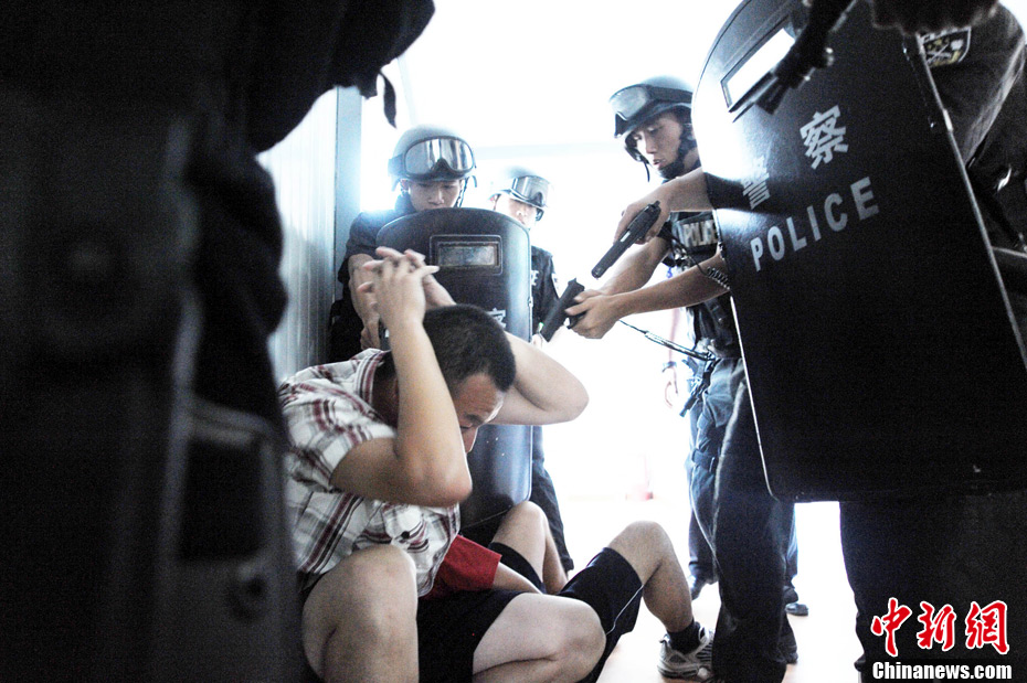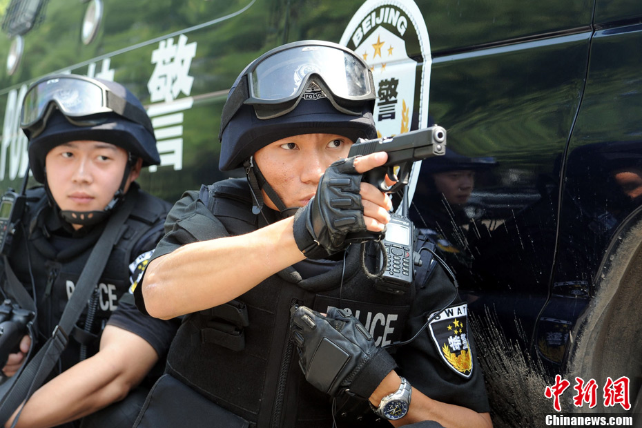 近日,北京警方在奧體中心體育館、北京科技大學體育館等4個場館和4個住地同時舉行多警種綜合演練,通過演練檢驗實戰效果和處突技能。根據預先制定的67個工作方案,有近11個警種在前期結合職責分工進行了單警種演練。本月27日起,涉及比賽和訓練的所有場館和住地將實行24小時封閉守護,北京警方將采取各種科技手段,確保首屆武搏會安全順利舉辦。中新社發 李連杰 攝