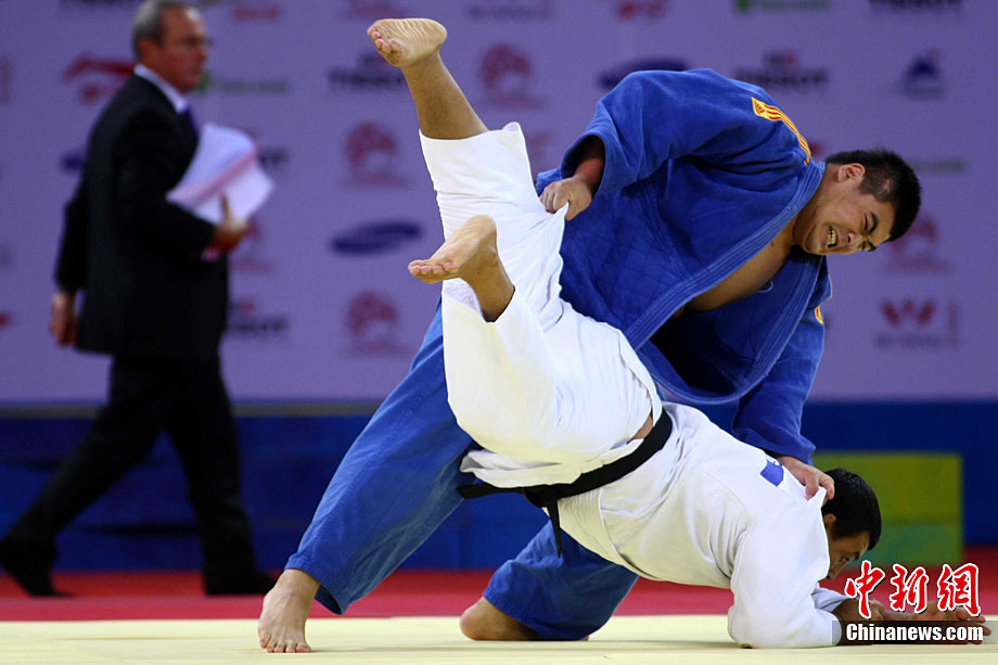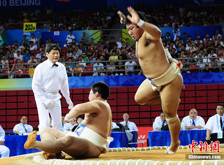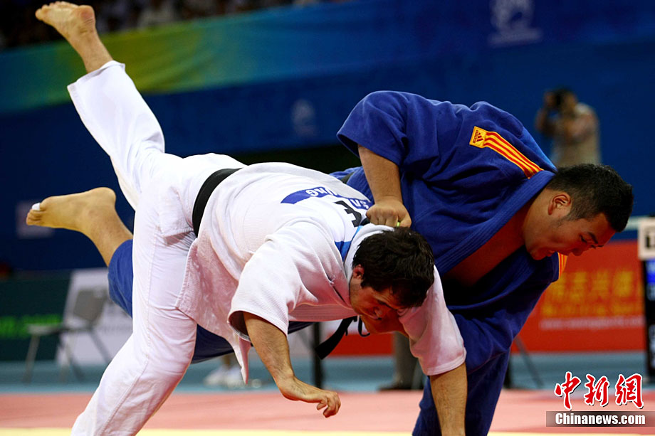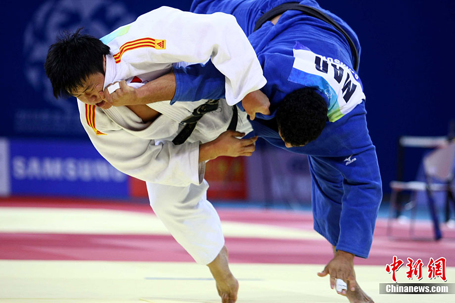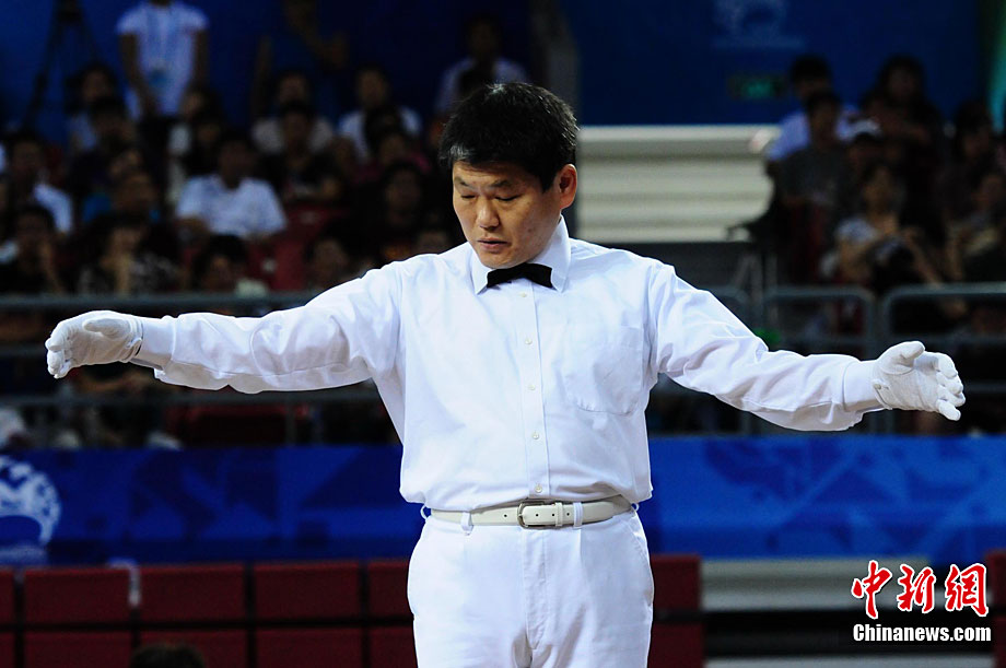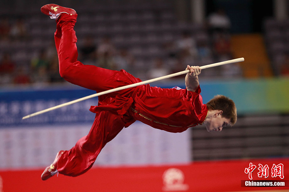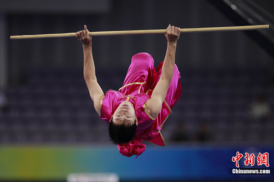 8月28日,2010年北京首屆武會進行首日比賽,其中武術項目的比賽在北京奧林匹克體育中心體育館進行。圖為中國香港選手Zheng Tian Hui在女子劍術的比賽中以9.80分穩居第一位。中新社記者 盛佳鵬 攝