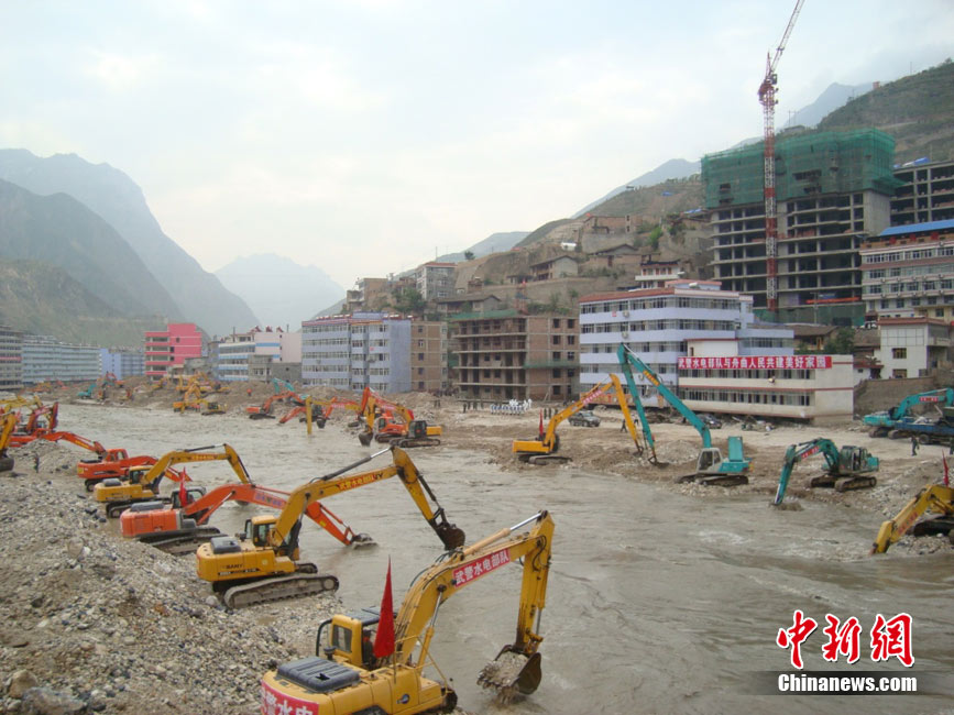 8月30日,舟曲白龍江堰塞湖應(yīng)急排險和河道應(yīng)急疏通任務(wù),比預(yù)定時間提前12小時全面完成。這是解放軍副總參謀長章沁生30日15時在舟曲白龍江城江橋頭召開的新聞發(fā)布會上,向社會公布的。章沁生在發(fā)布會上說,到30日12時,城江橋至城關(guān)橋段水位已回落至省道313線最低點(diǎn),城區(qū)積水全部回流歸槽,標(biāo)志著舟曲白龍江堰塞湖應(yīng)急排險和河道應(yīng)急疏通任務(wù)全面完成。舟曲特大山洪泥石流災(zāi)害發(fā)生后,導(dǎo)致白龍江形成堰塞湖致使江水水位暴漲,舟曲縣城三分之一街區(qū)被淹。武警水電部隊、蘭州軍區(qū)工程兵某部每天出動上千官兵,大型機(jī)械百余臺,先是排除了堰塞湖潰決險情,從13日轉(zhuǎn)入河道應(yīng)急疏通任務(wù),24小時持續(xù)奮戰(zhàn),終于提前完成了這一艱巨任務(wù)。圖為在舟曲縣城江橋上游河段,解放軍和武警部隊晝夜不停對河道進(jìn)行除險清淤。 中新社發(fā) 郭海勇 攝