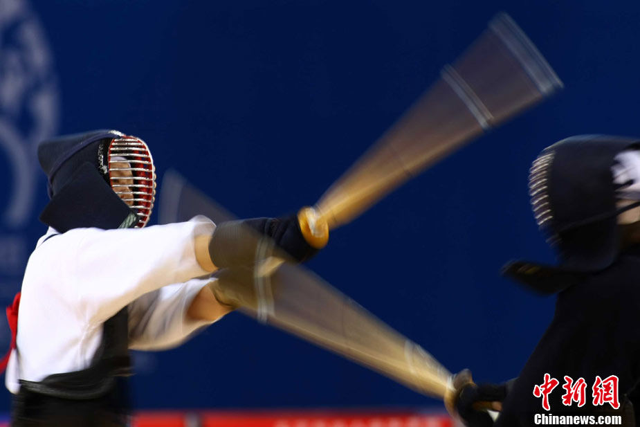 9月3日,2010年北京首屆世界武搏運動會劍道比賽在北京科技大學體育館開賽,當天舉行男、女個人賽預賽和決賽及女子特殊邀請賽預賽和決賽。圖為在男子個人邀請賽中,日本選手昭司寺本(Shoji TERAMOTO)(右)和巴西選手奧納卡(Ernesto Eisaku ONAKA)在比賽中。中新社記者 盛佳鵬 攝
