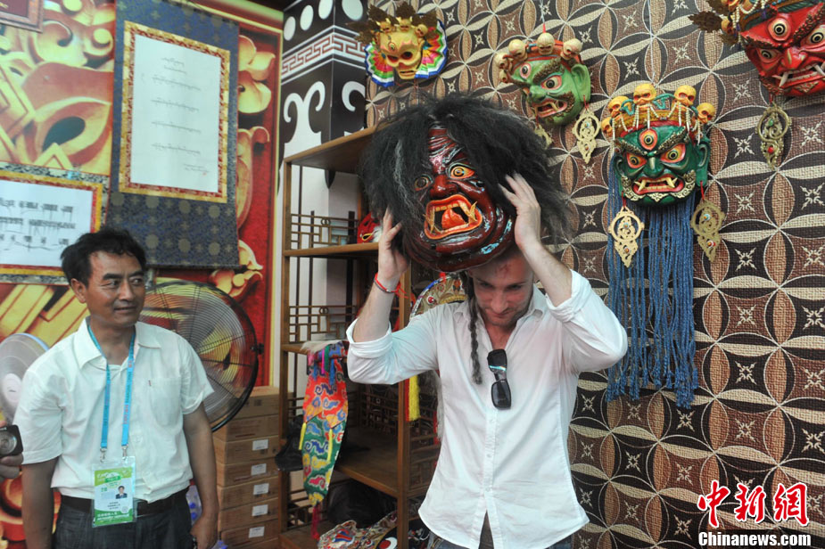 9月3日,上海世博會西藏活動周進入第3天。土耳其姑娘Esmeralda Sinani來到上海世博會寶鋼大舞臺,體驗藏族文化。圖為Esmeralda Sinani在喝酥油茶,并向藏族人吉吉了解酥油茶相關的文化。 中新社記者 蔣雪林 攝