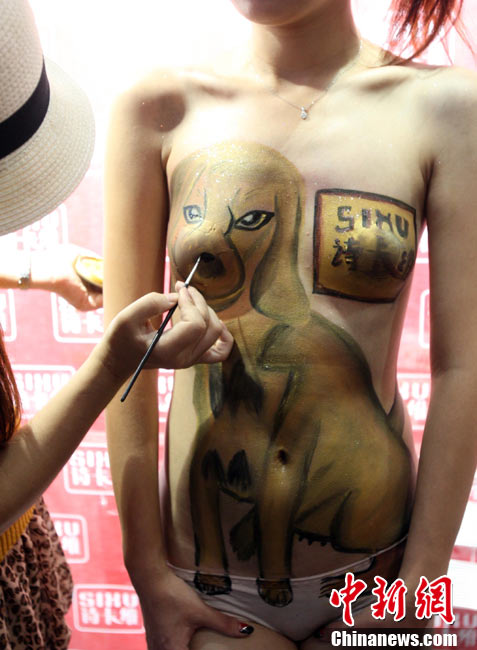 9月4日,正在上海國際展覽中心舉行的第十三屆亞洲寵物展覽會上,展商特意請來助陣的人體彩繪吸引了不少觀眾的眼球。中新社記者 湯彥俊 攝