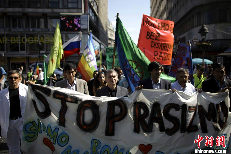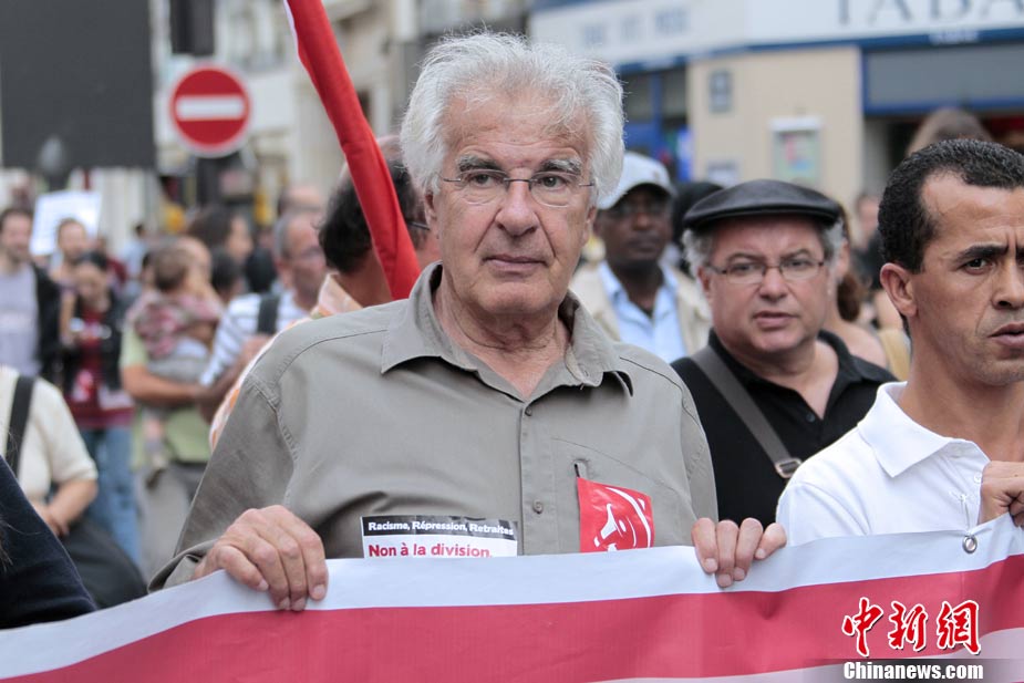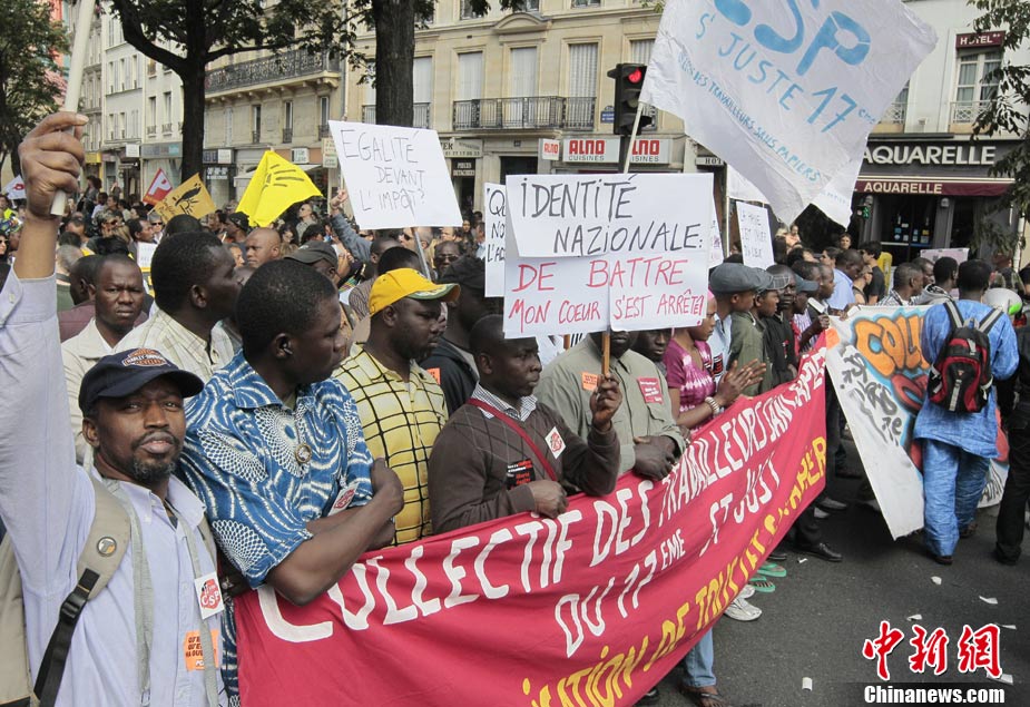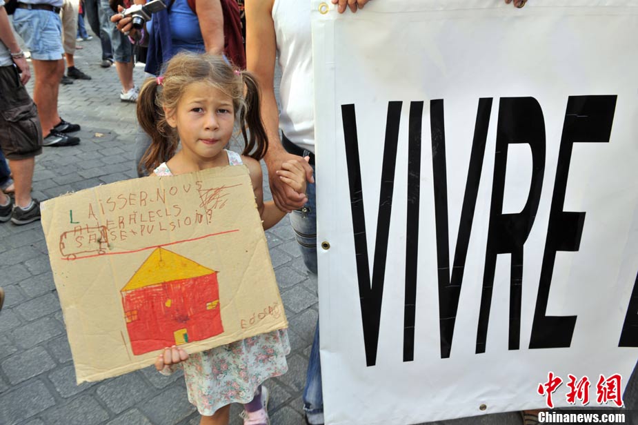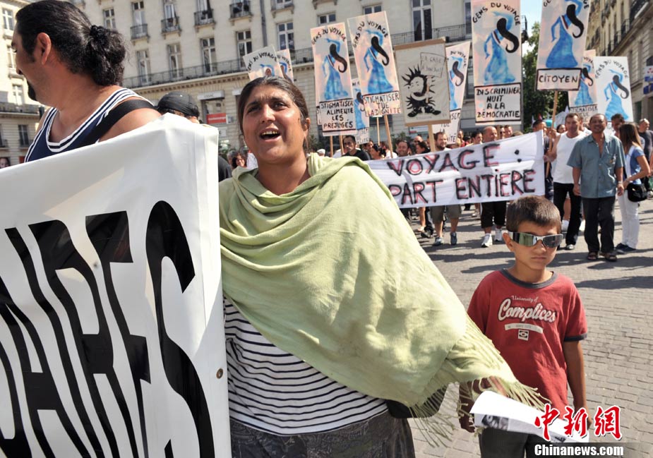 法國全國各地4日有數(shù)以萬計(jì)的群眾上街示威,抗議政府最近采取新政策,強(qiáng)行驅(qū)逐吉卜賽人出境。歐洲其它城市包括貝爾格萊德和羅馬,也有群眾游行聲援吉卜賽人。圖為在法國南特,民眾示威抗議政府強(qiáng)行驅(qū)逐吉普賽人。