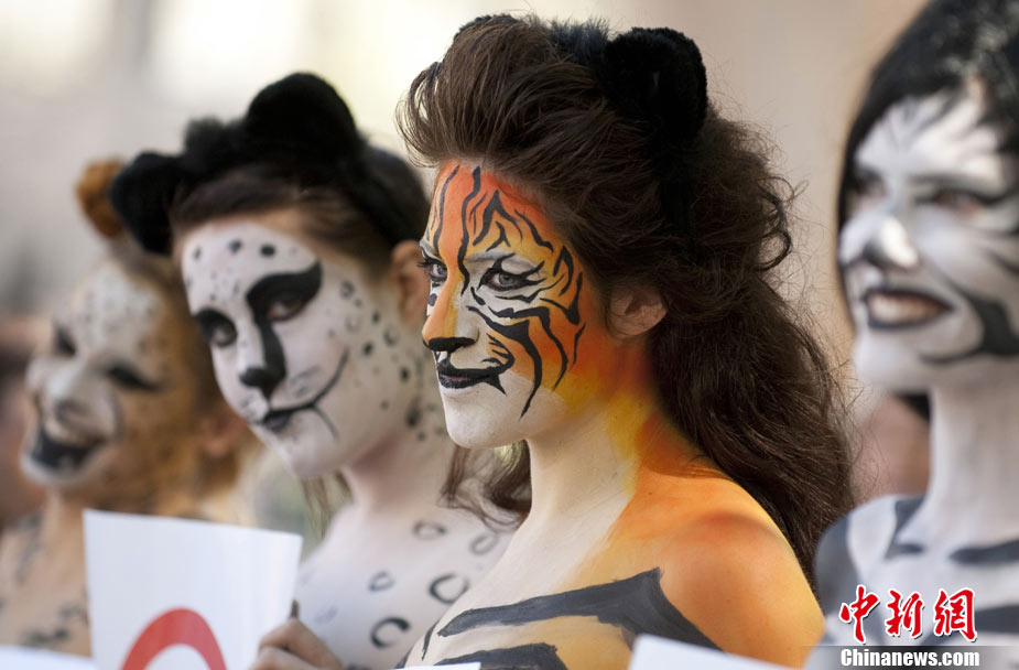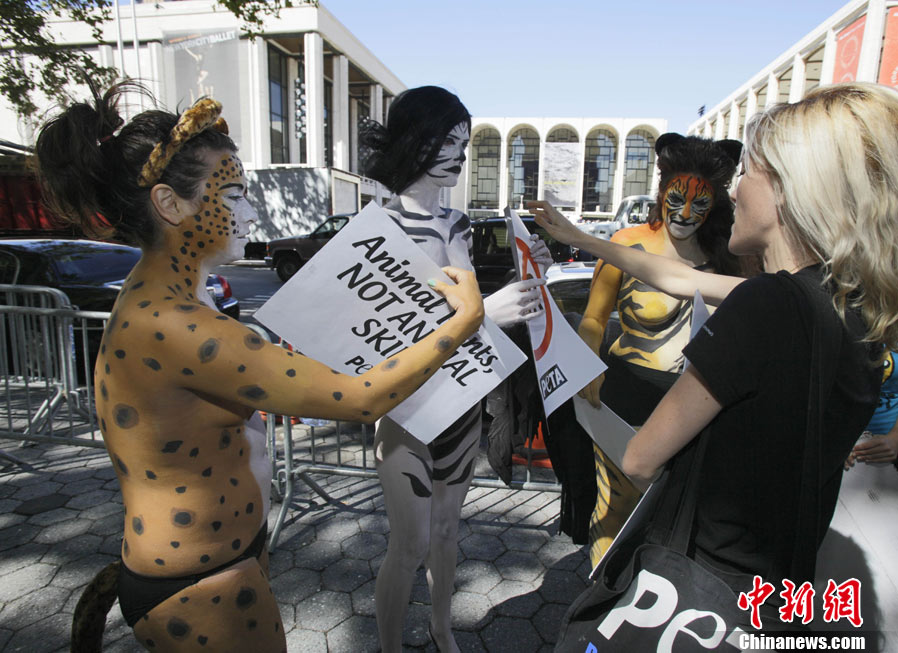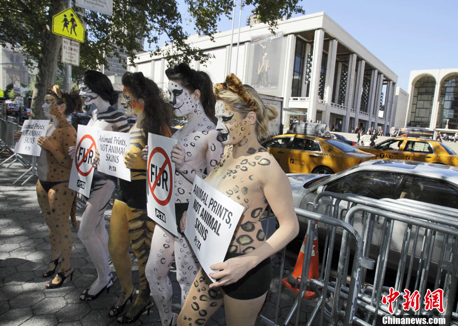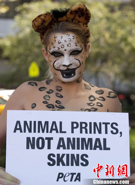 9月14日,在紐約時裝周進行期間,幾位環保愛好者在身上涂畫“動物彩繪”,呼吁保護動物,愛護環境。