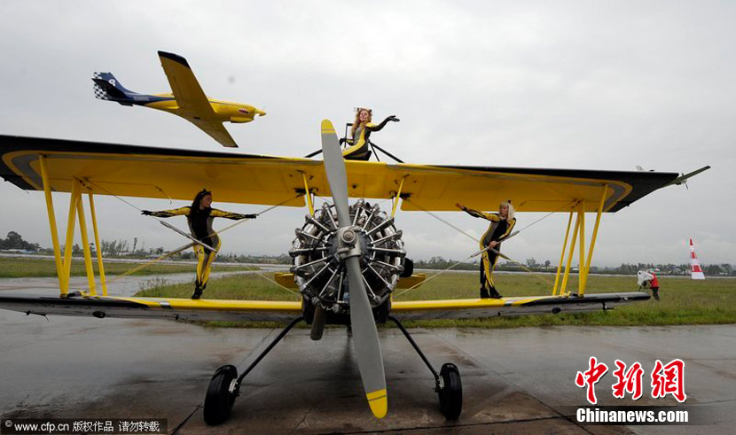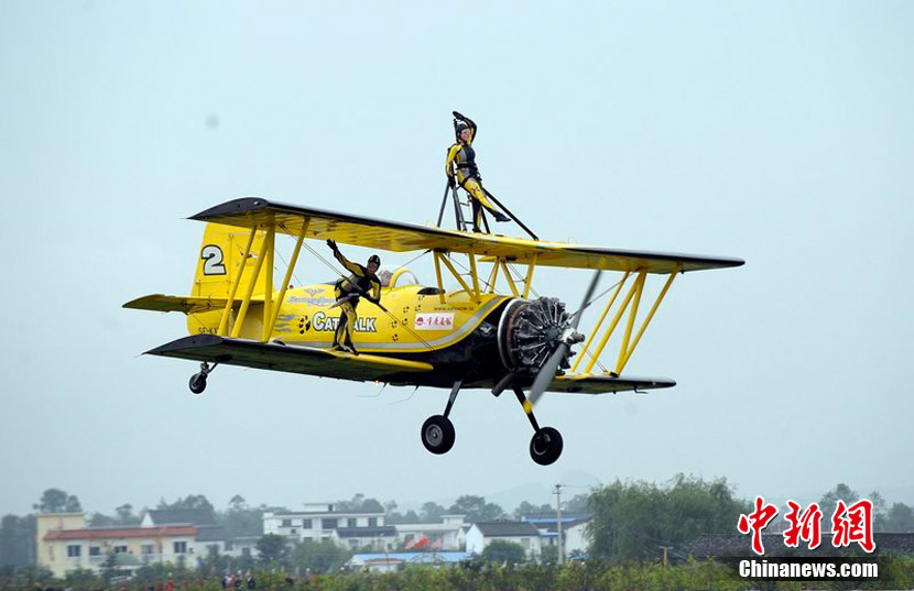 2010年9月30日,2010年首屆中國(重慶)國際飛行愛好者年會暨國際通用航空器展示交易會在重慶梁平縣開幕。雖本場航空表演僅對專業人士開放,仍然吸引了3萬人涌進梁平機場。圖為瑞典貓女郎準備進行“機翼行走”特技表演。圖片來源:CFP視覺中國