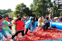 今年“十一”國慶長假期間,海南遭49年一遇持續暴雨襲擊,上百村莊被洪水淹沒,截止10月6日17時,全省已轉移受災群眾132388人。圖為瓊海市博鰲鎮朝烈村委會被洪水圍困的居民淌水外購食品自救。中新社發 付美斌 攝