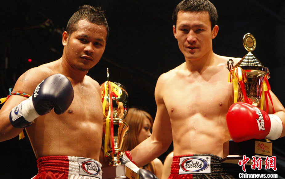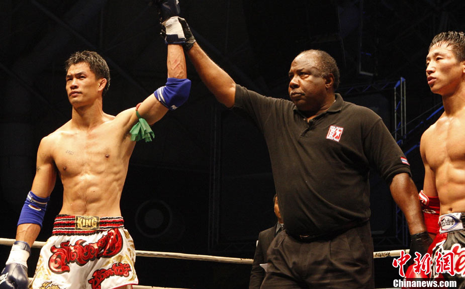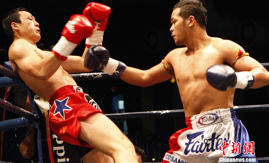 10月9日晚,由馬來西亞IPC國際集團和中國國際文化傳播中心以及英雄傳說賽事機構聯手主辦的“英雄傳說-決戰云頂”世界搏擊王者爭霸賽暨中泰拳王爭霸戰在馬來西亞吉隆坡云頂舉行。圖為泰國拳王雅桑克萊與中國王冠對決。 中新社記者 錢興強 攝