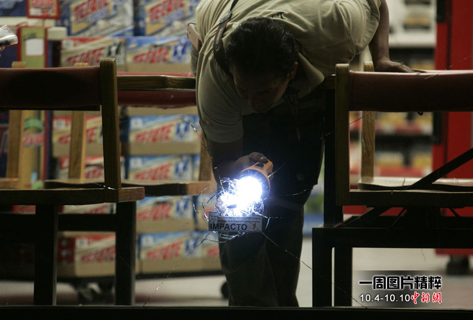 10月4日(周一),一名警務(wù)人員在首爾警員訓(xùn)練中心示范用頭撞碎多層石板。