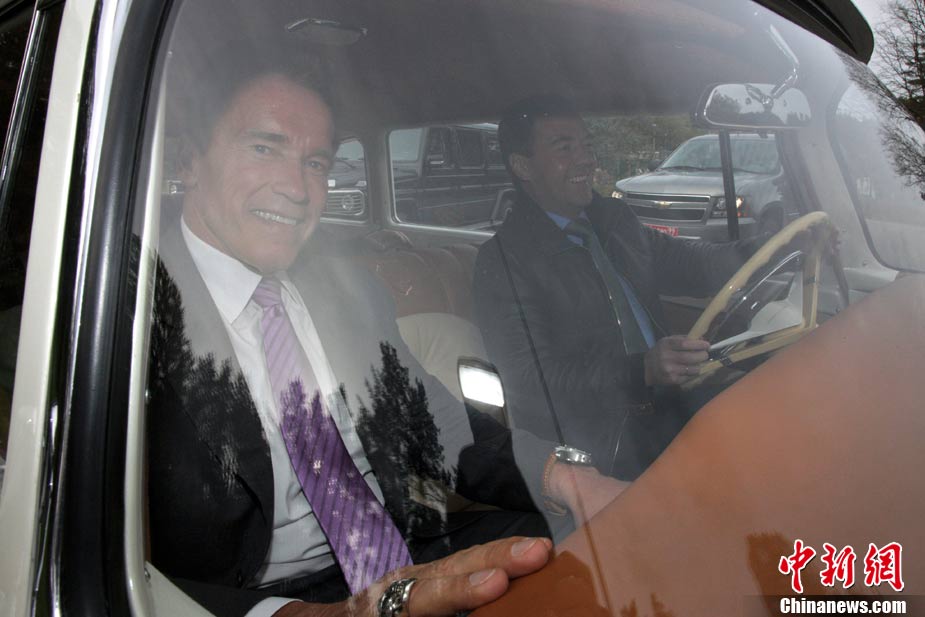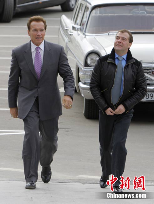 10月11日,莫斯科,美國加州州長施瓦辛格訪問俄羅斯,與俄羅斯總統(tǒng)梅德韋杰夫會面。梅德韋杰夫總統(tǒng)還為施瓦辛格客串了一把“司機。”