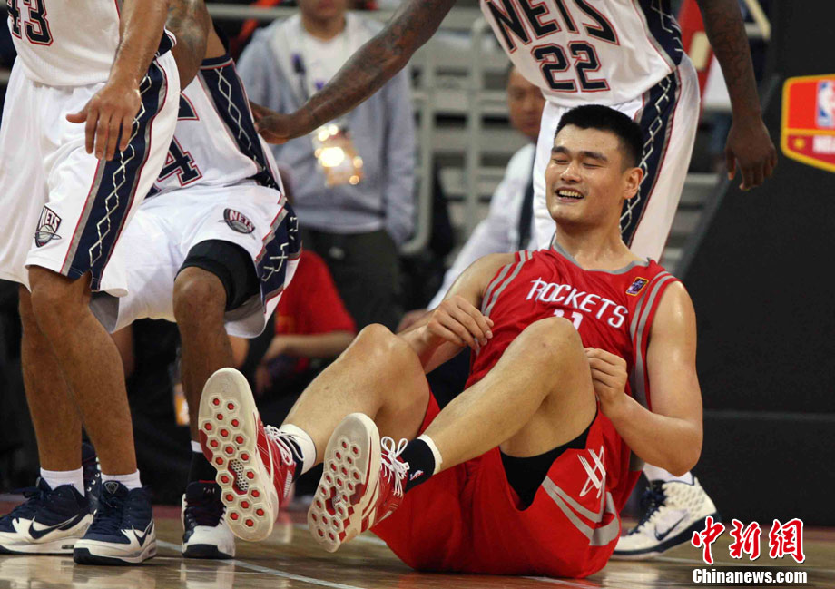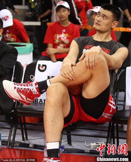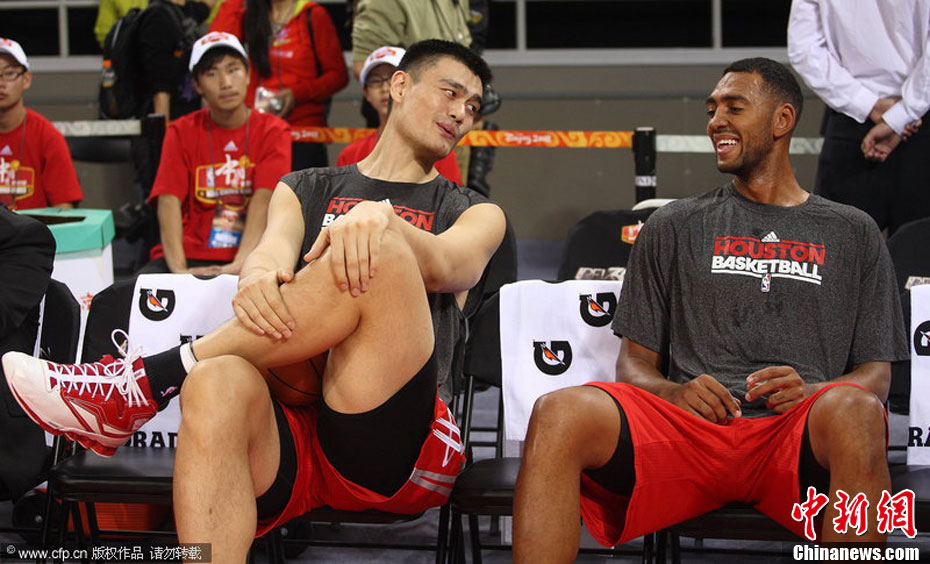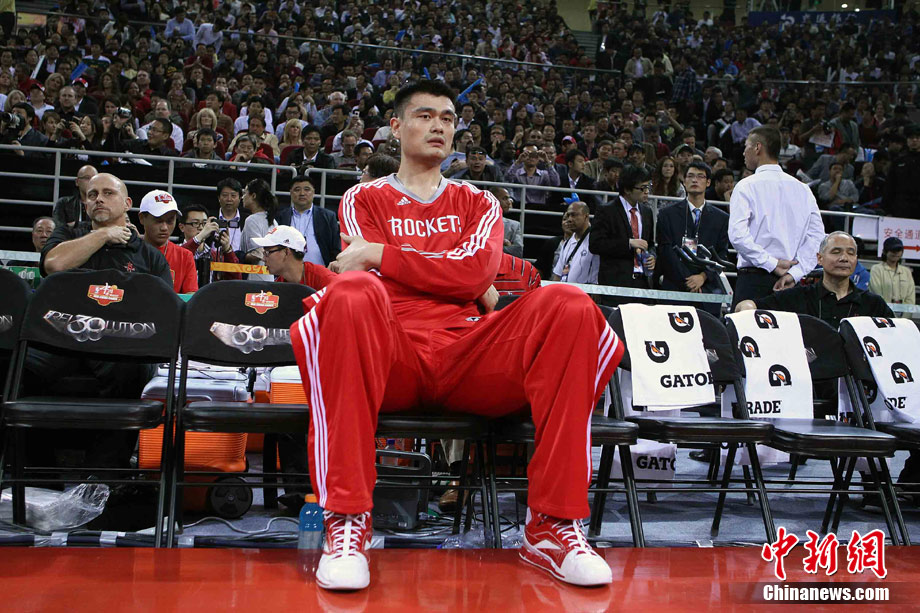 10月13日,NBA中國賽第一場比賽在北京五棵松體育館舉行,休斯敦火箭隊迎戰新澤西網隊。兩支球隊將于本月16日在廣州進行第二場比賽。圖為姚明熱身后在場邊休息。圖片來源:CFP視覺中國