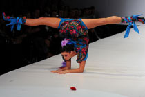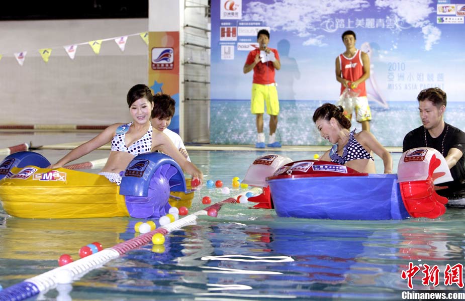 10月19日,參加《2010亞洲小姐競選》(港澳賽區)的9號佳麗陳明月(右)和10號佳麗何婭換上泳裝,進行水上競技,以各種游戲方式放松心情去迎接總決賽。中新社發 洪少葵 攝