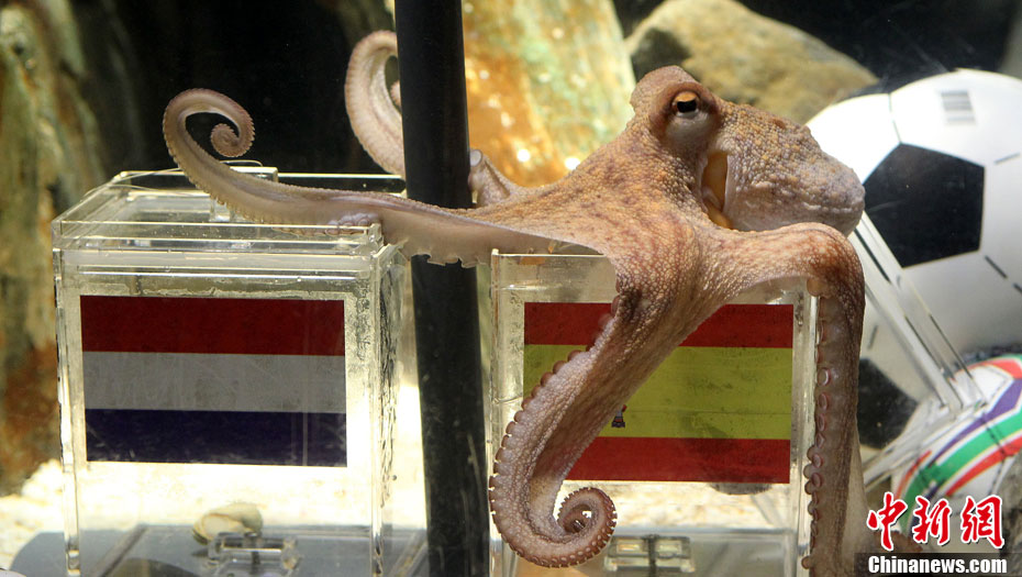 據悉,保羅的尸體目前已被冷藏,水族館正在商討“怎樣以最好的形式紀念”。圖為在世界杯后章魚保羅獲贈一件印有它名字的西班牙隊隊服。