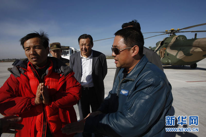 10月27日,新疆維吾爾自治區應急辦主任伊力(中)將被困的工程師帶上直升機。圖片來源:新華網 李翔 攝