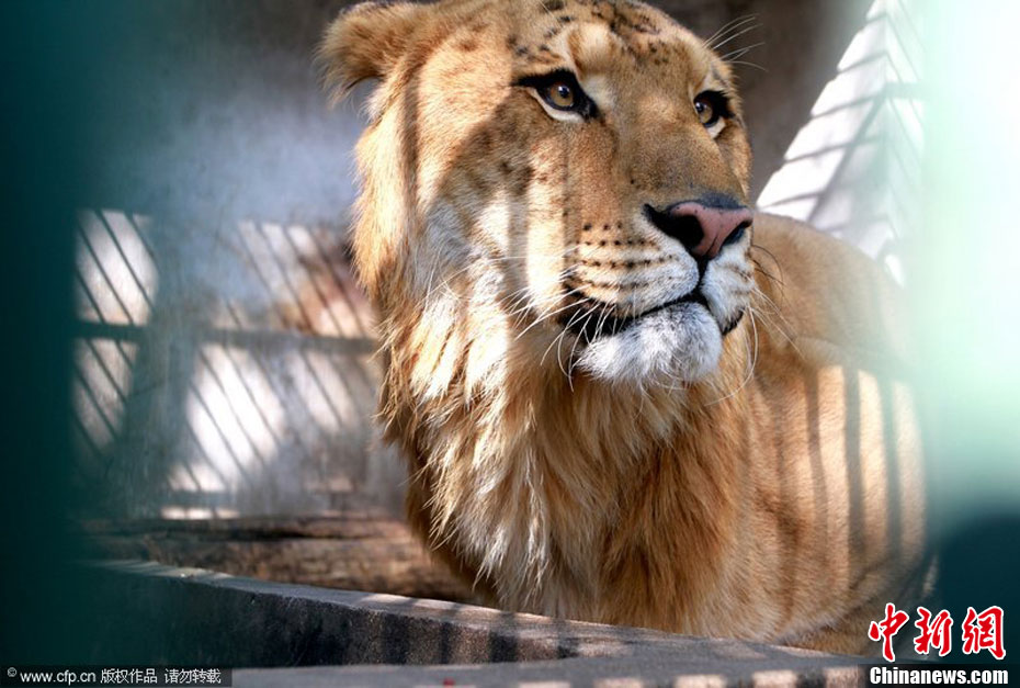 2010年10月27日,江西九江甘棠公園動物園工作人員正隔著鐵欄桿在給一只虎頭獅身的“怪物”撓癢。這只“怪物”名叫獅虎獸,是是雄性獅子和雌性老虎交配產生的后代。此只獅虎獸引進自安徽安慶,目前已三歲,這是獅虎獸首次亮相江西,有關資料顯示,獅虎獸的成活率只有50萬分之一,目前世界上存活的獅虎獸只有20只左右,所以被形容為比熊貓還珍貴的動物。 圖片來源:CFP視覺中國