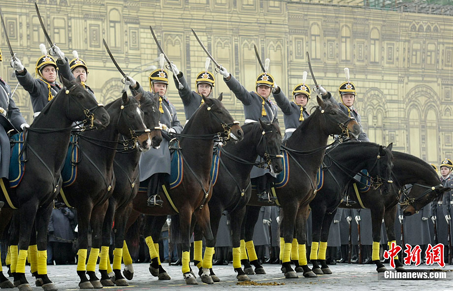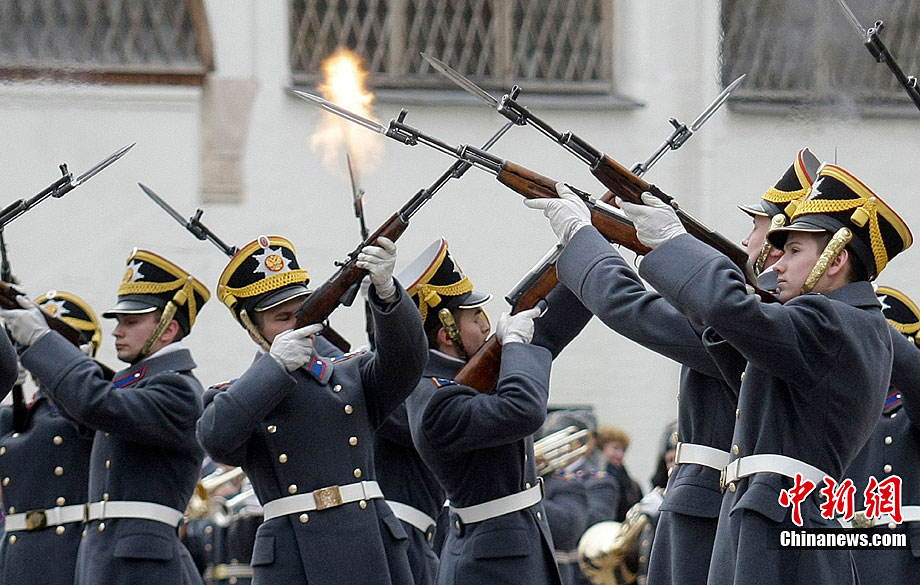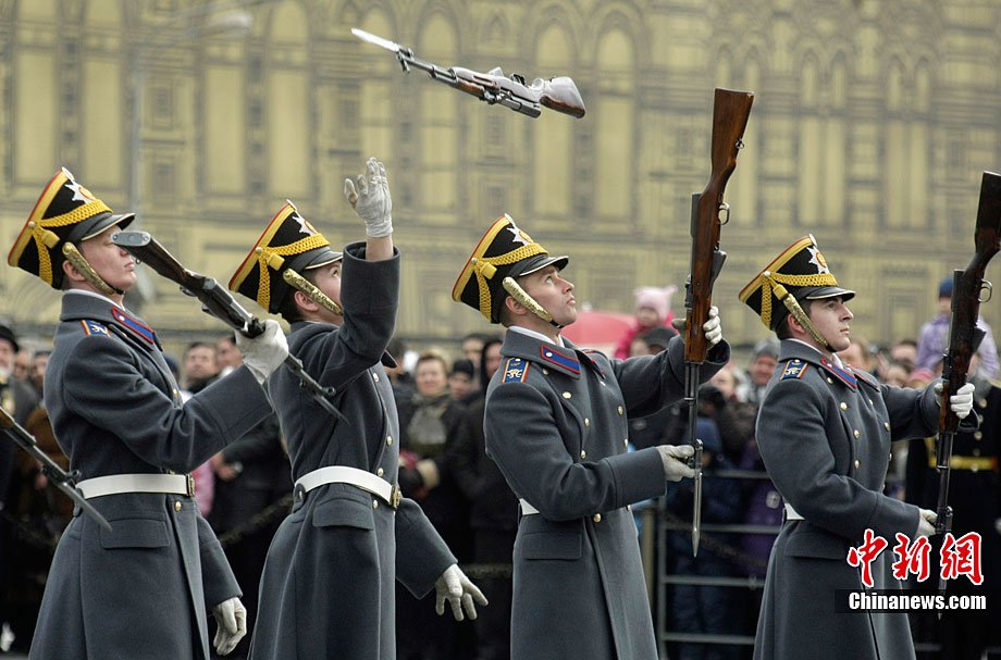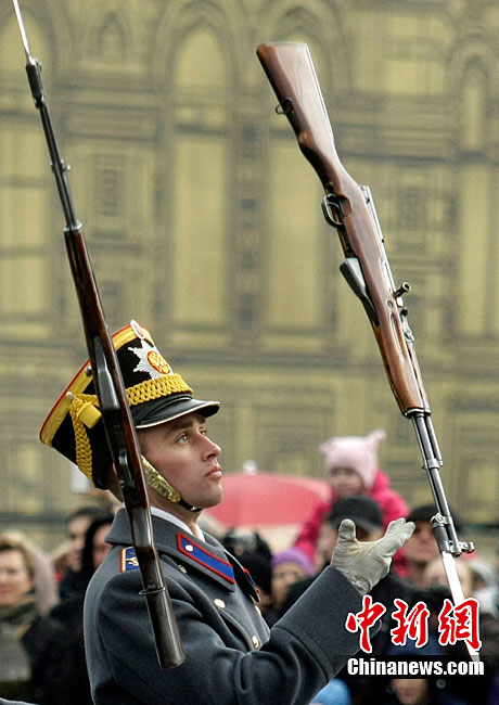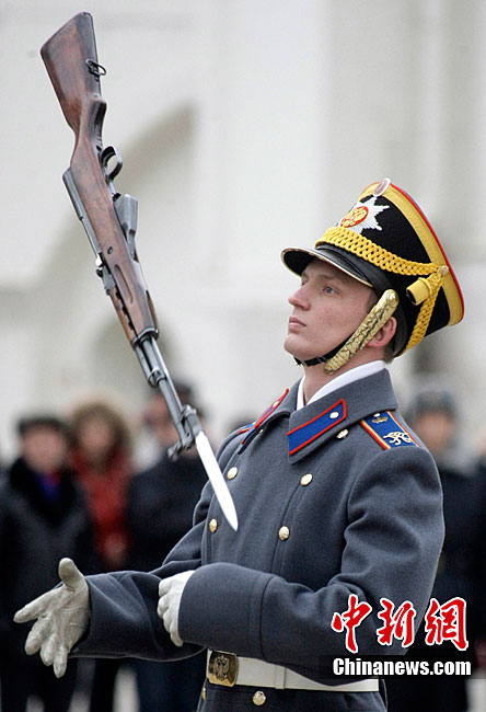 當地時間10月30日,俄羅斯首都莫斯科的克里姆林宮前衛兵舉行了隆重的換崗儀式。圖為衛兵在換崗儀式上舉行花槍表演。
