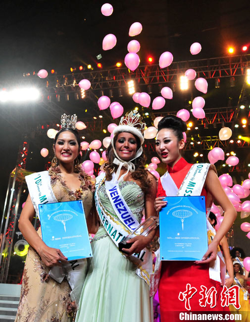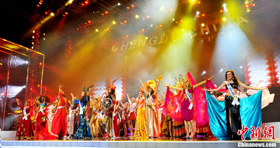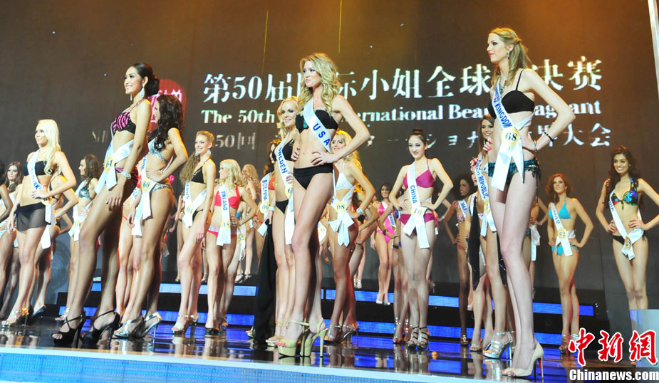 11月7日晚,第50屆國際小姐世界大會全球總決賽在成都拉開帷幕。來自全球70個國家和地區(qū)的70名佳麗經(jīng)過激烈角逐,最終委內(nèi)瑞拉小姐Elizabeth Mosquera摘得桂冠,泰國小姐Piyaporn Deejing、中國小姐袁思怡分獲亞軍和季軍。圖為各國佳麗的進行泳裝展示。中新社發(fā) 安源 攝