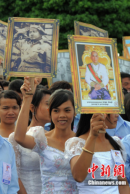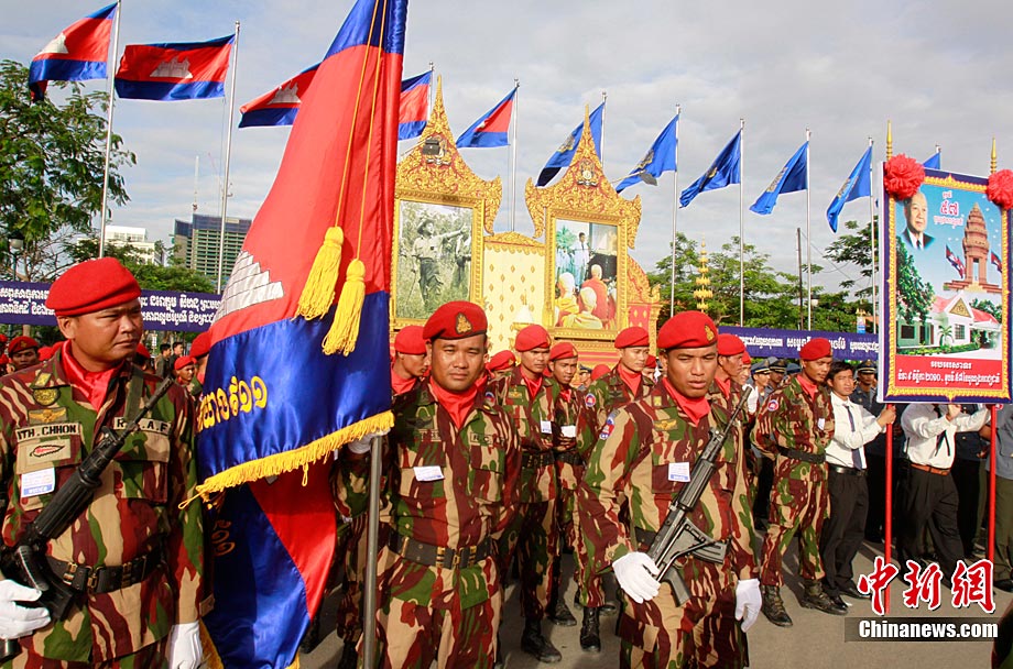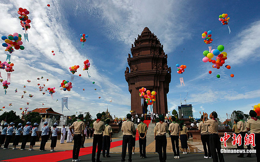 11月9日,工作人員在獨(dú)立節(jié)慶祝儀式上放飛彩球。當(dāng)天,柬埔寨在金邊獨(dú)立紀(jì)念碑廣場舉行盛大儀式,熱烈慶祝國家獨(dú)立57周年。柬埔寨國王西哈莫尼、國會(huì)主席韓桑林、政府首相洪森等政要以及各國駐柬使節(jié)和各界代表約2萬人出席儀式。