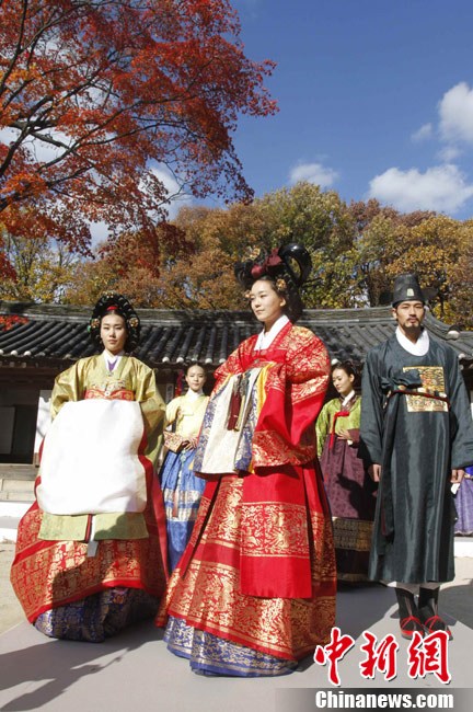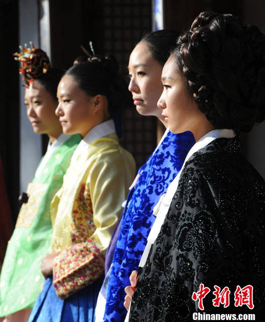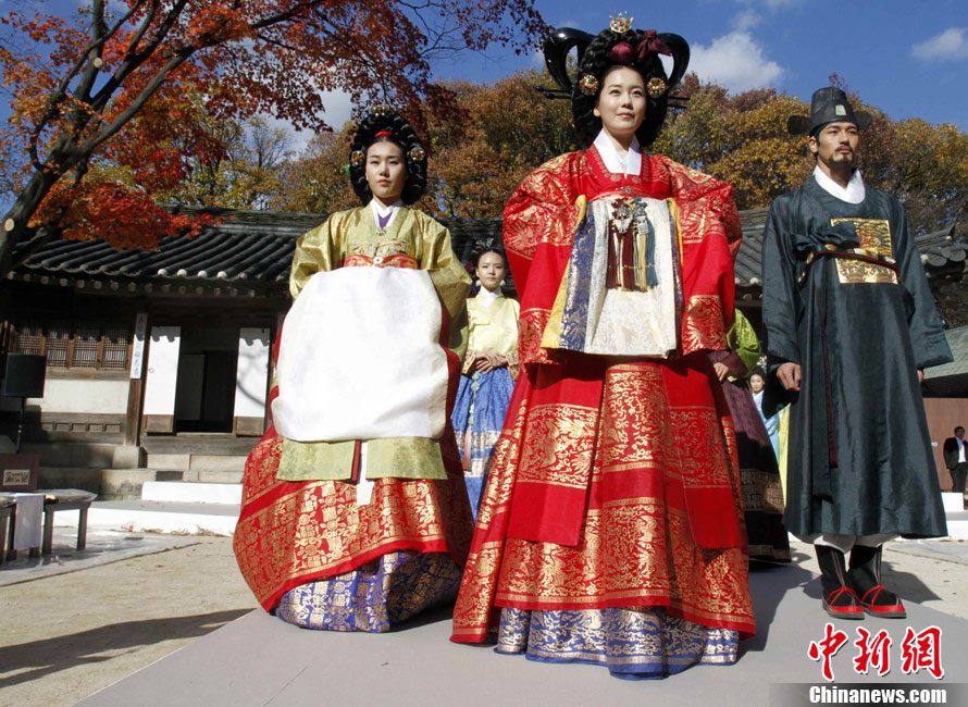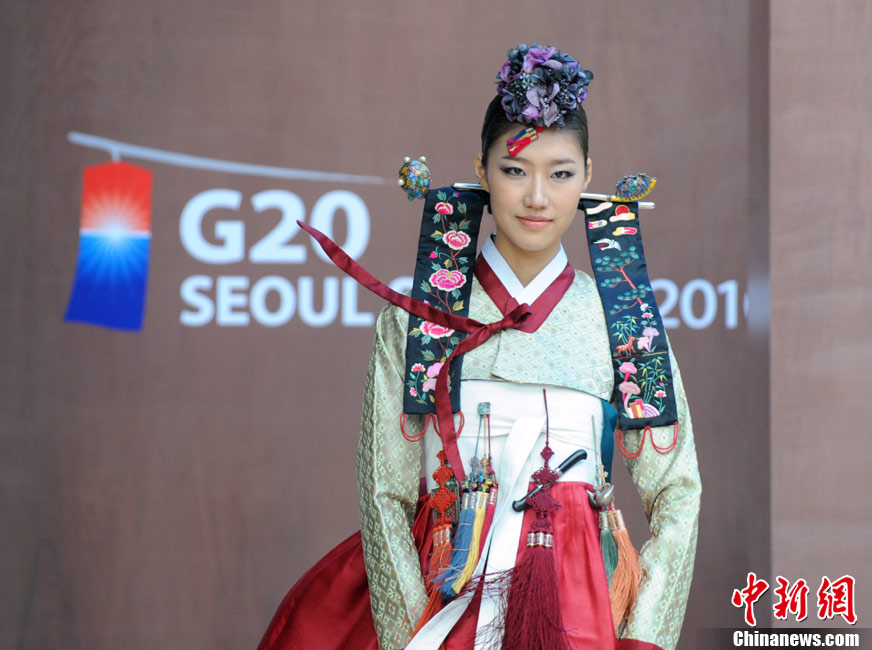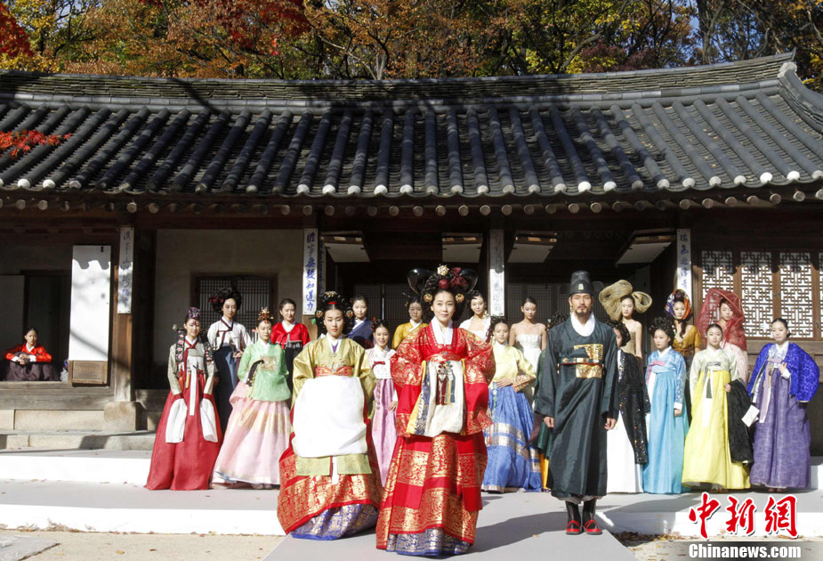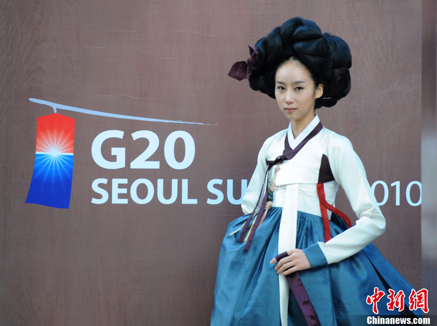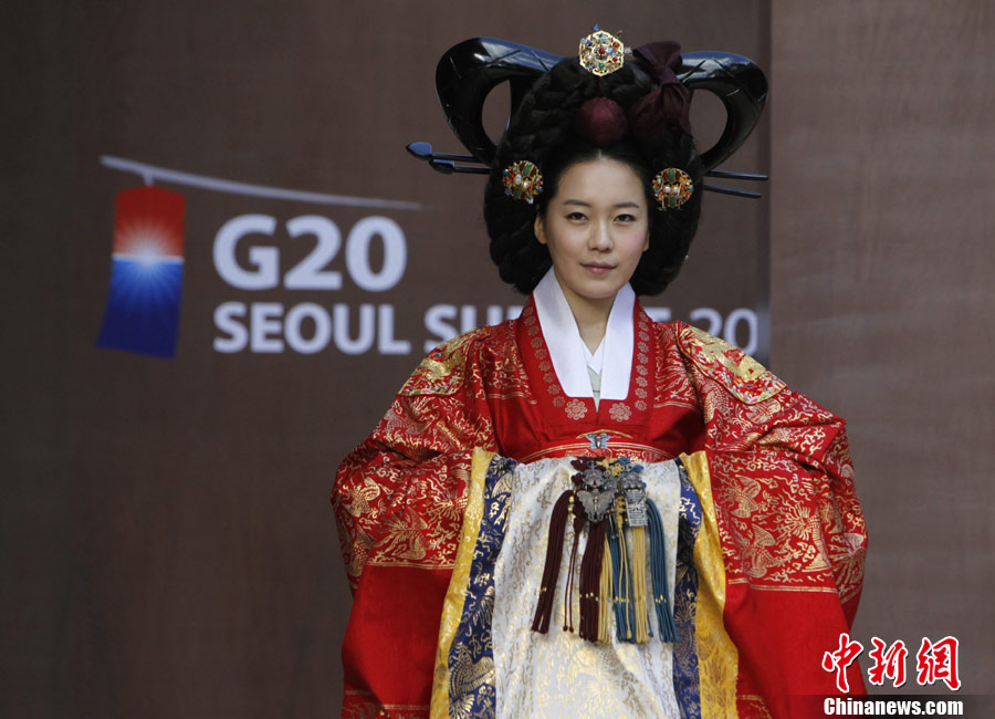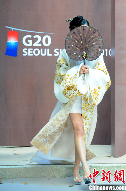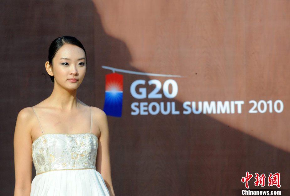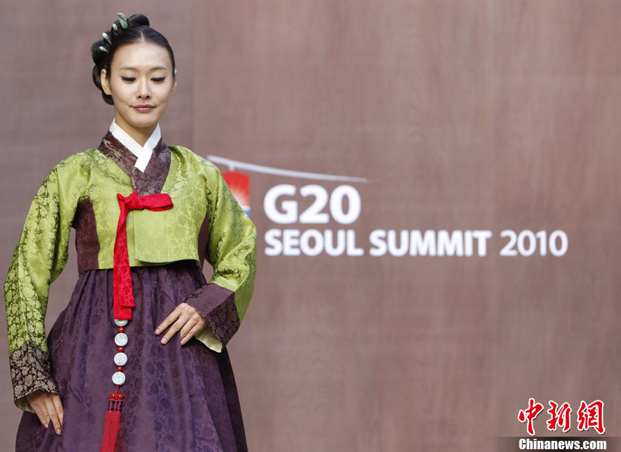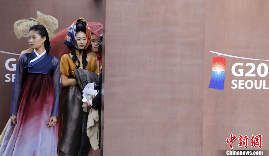 11月9日,韓國首爾昌德宮,模特進行韓服服裝秀的排練。本次服裝秀是G20峰會期間的活動之一。
