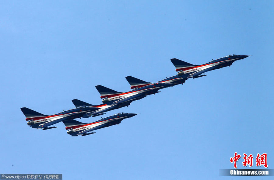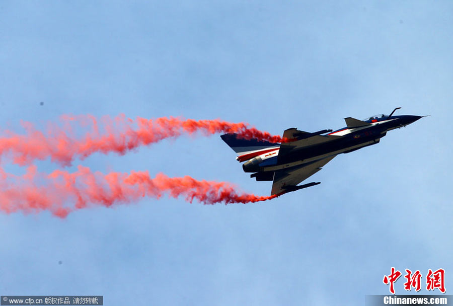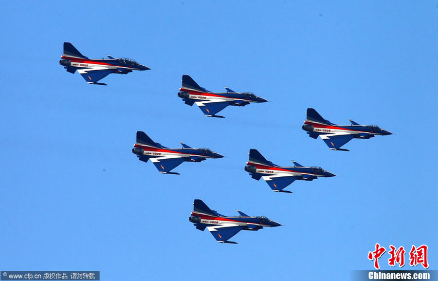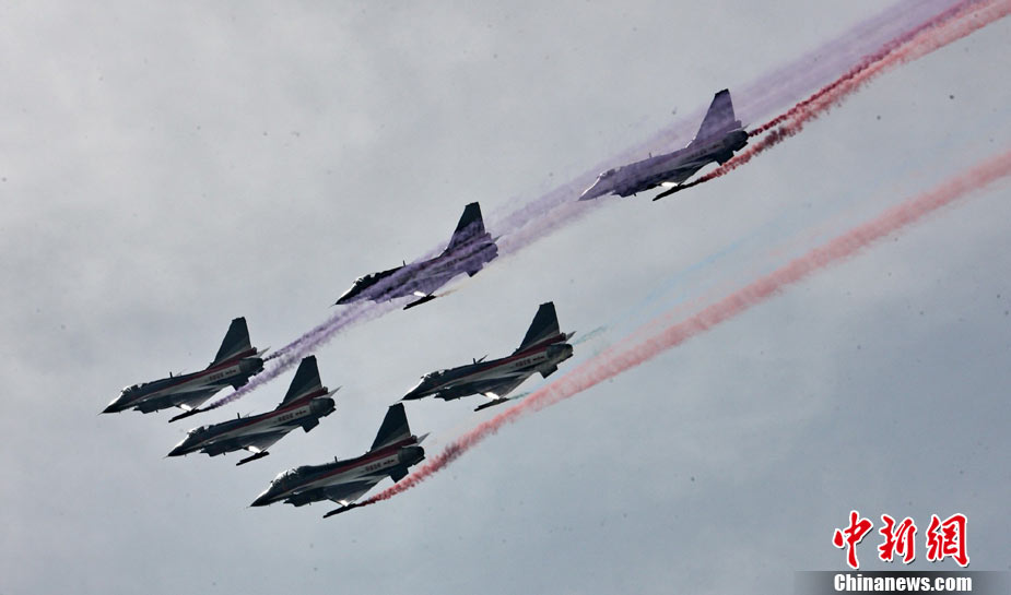 11月11日,珠海,中國(guó)空軍八一飛行表演隊(duì)首次進(jìn)行六機(jī)編隊(duì)演練,同時(shí)還進(jìn)行了拉煙、直立爬行、兩機(jī)穿越空中翻滾等高難度動(dòng)作的演練。第八屆珠海國(guó)際航展將于11月16日開幕。于燕敏 攝 圖片來(lái)源:CFP視覺中國(guó)