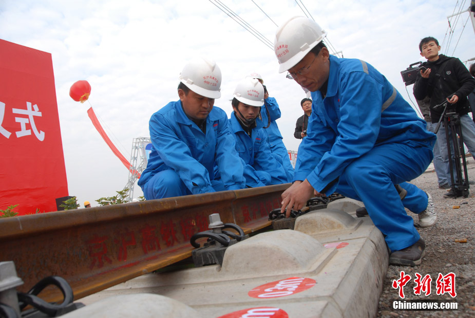 11月15日上午,隨著最后一根鐵軌在安徽蚌埠段順利鋪下,京滬高速鐵路全線完成鋪通工程,這是京滬高速鐵路建設取得的又一重大階段性成果。京滬高速鐵路的全線鋪通,標志著以線下工程和鋪軌為主的站前工程全部結束,下一步將全力推進以牽引供電、通信、信號、電力“四電集成”施工和站房建設為主的站后工程施工,展開全線聯調聯試。圖為15日,京滬高鐵先導段鋪通儀式在京滬高鐵蚌埠南火車站舉行。中鐵十五局員工在接軌點安裝最后一組鋼軌鎖定螺栓。(張智海 范剛軍 李紅)