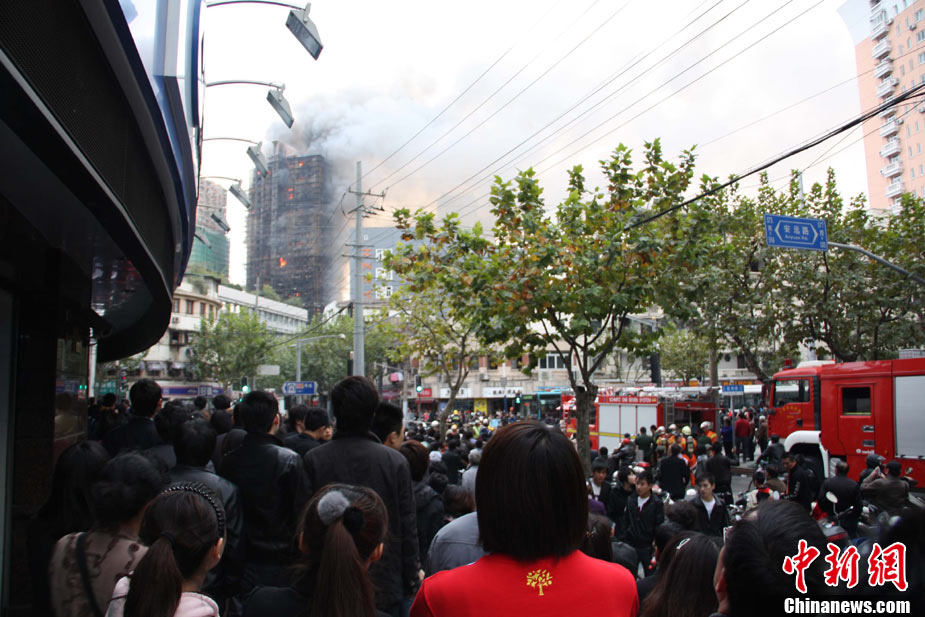 11月15日下午2時15分,上海中心城區(qū)靜安區(qū)正在進(jìn)行外墻裝修的教師公寓的腳手架起火,火警發(fā)生后,公安民警、消防隊員迅速趕往現(xiàn)場救援,到場消防車超過10輛。起火原因和損失狀況正在進(jìn)一步調(diào)查中。中新社發(fā) 張嘉森 攝