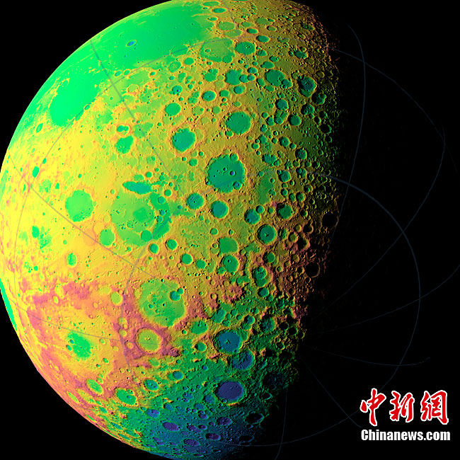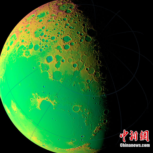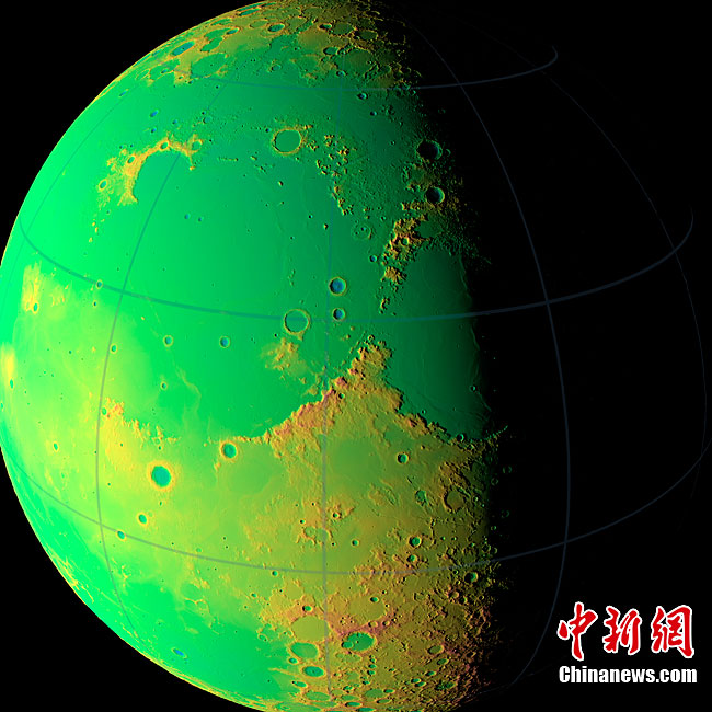 12月17日,美國航天局對外公布了月球勘測軌道飛行器攜帶的月球軌道飛行器激光測高儀(LOLA)對該地點(diǎn)進(jìn)行的高度測量。科學(xué)家稱,月球勘測軌道飛行器使研究者能制造出最精確且最完整的月球地形圖。紅色代表月球最高點(diǎn),藍(lán)色代表最低點(diǎn)。