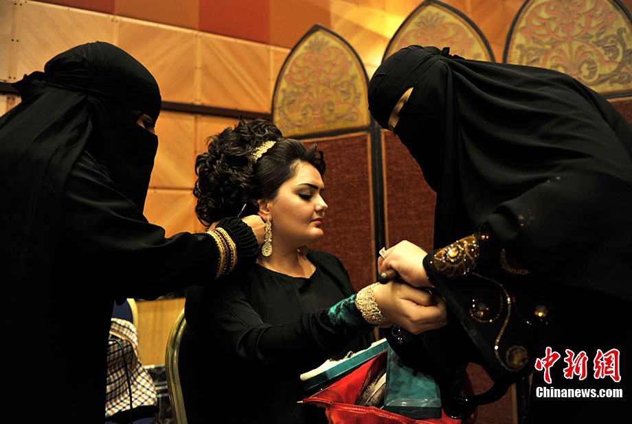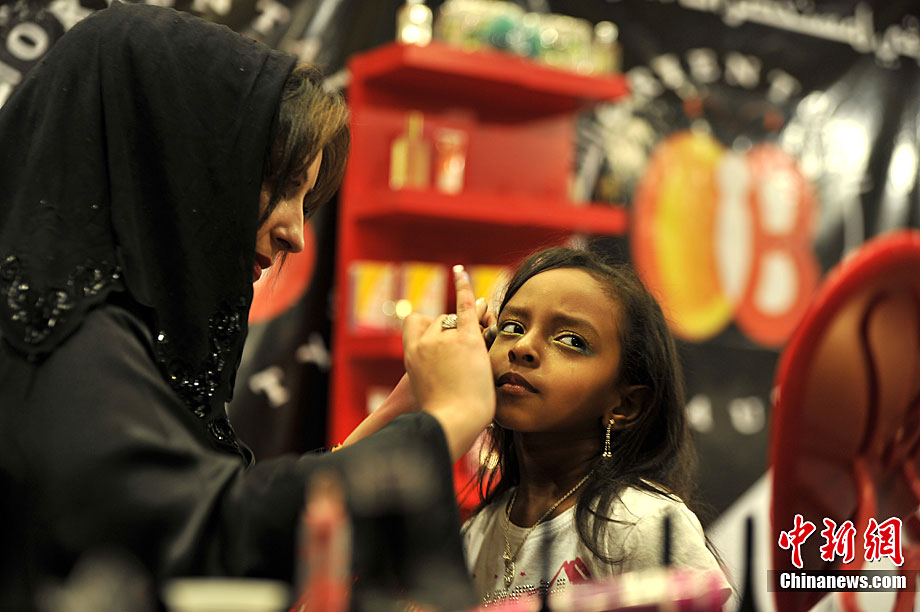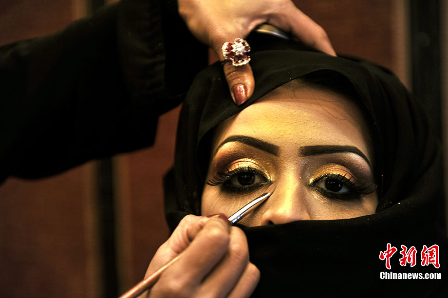 當地時間12月21晚,沙特2010化妝用品博覽會在沙特阿拉伯的吉達市舉行,此次博覽會為期四天。圖為沙特婦女在博覽會上進行現場化妝。