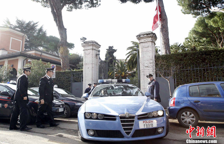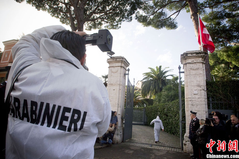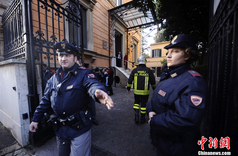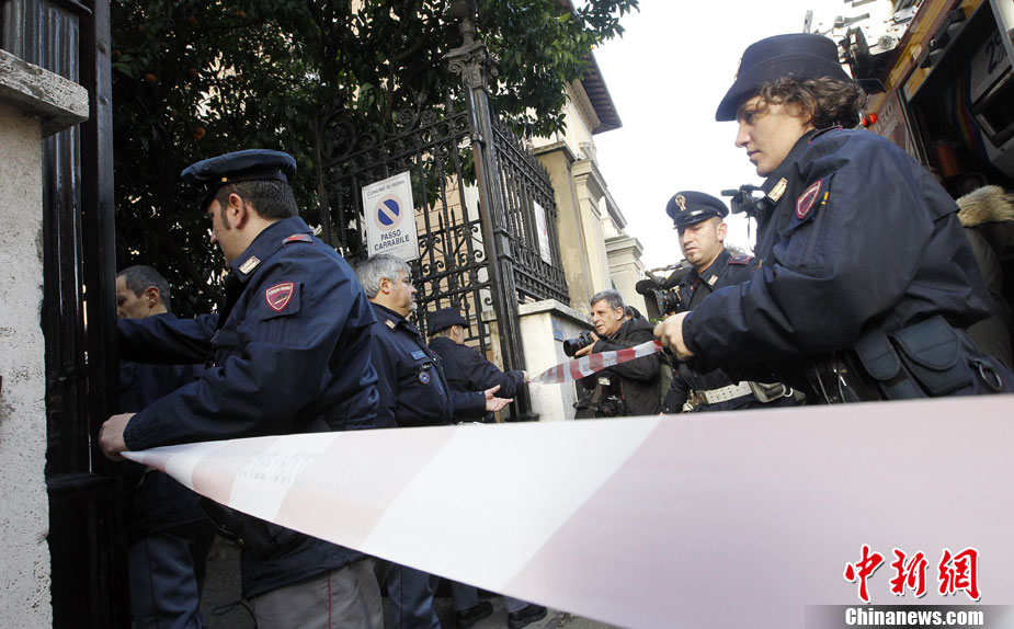 瑞士駐意大利使館一名職員當(dāng)天在拆開一個郵包時,郵包發(fā)生爆炸,該工作人員雙手嚴(yán)重受傷,目前正在醫(yī)院接受治療。時隔不久,智利駐意大利使館也發(fā)生郵包爆炸事件,一名工作人員受傷,所幸沒有生命危險。圖為在智利大使館前警方拉起了警戒線。