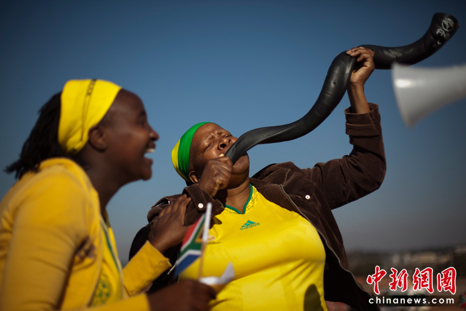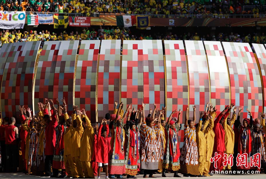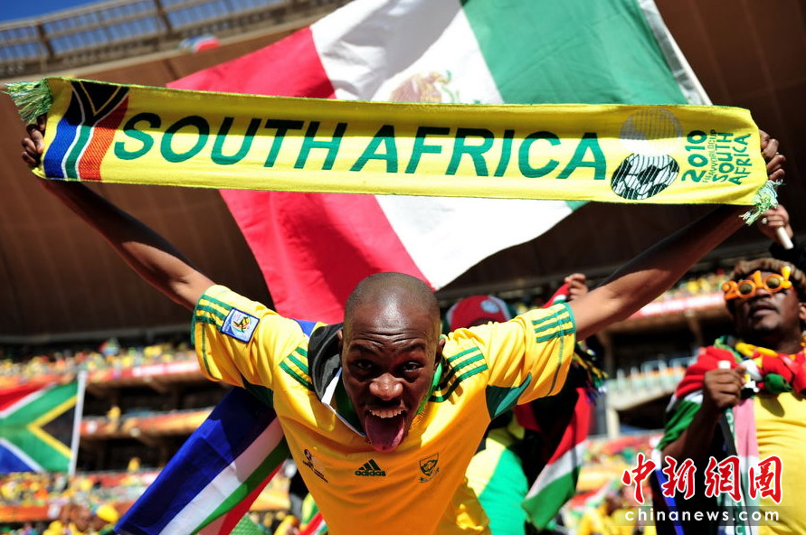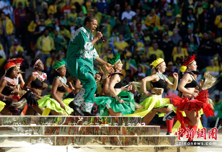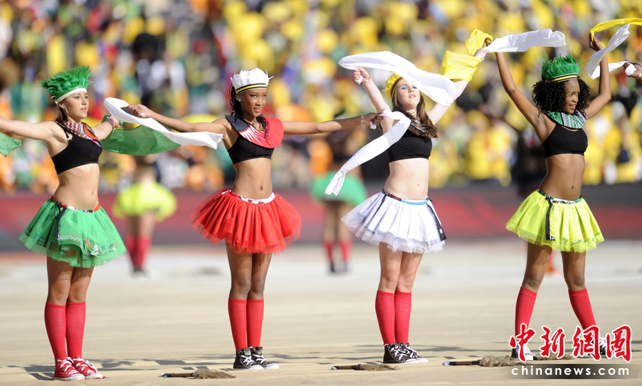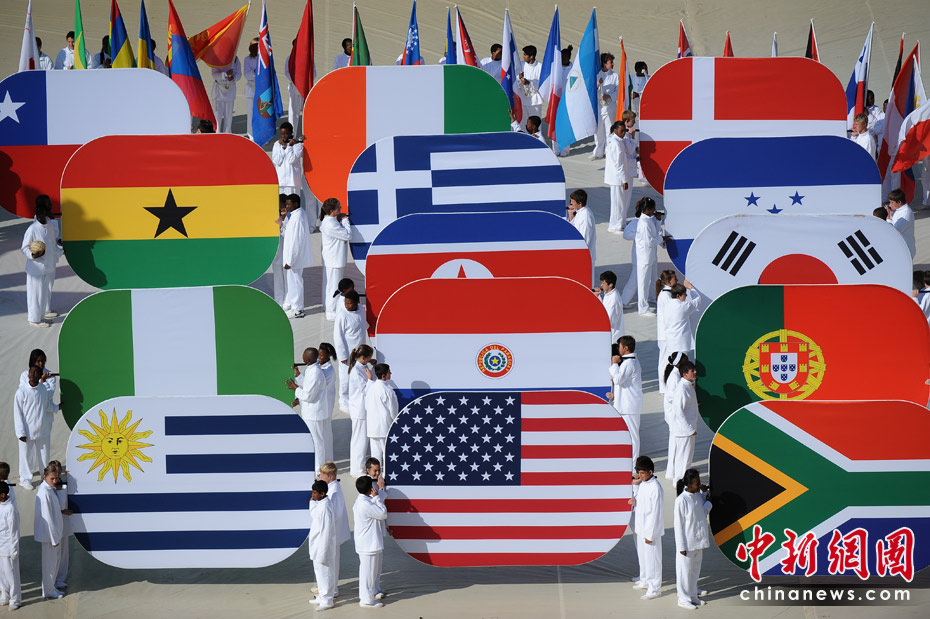 北京時間11日晚8時10分,南非世界杯足球賽開幕儀式在約翰內斯堡的足球城體育場拉開帷幕。開幕儀式前,南非共和國的空軍進行了飛行表演。五架飛機在世界杯賽場滑翔而過。