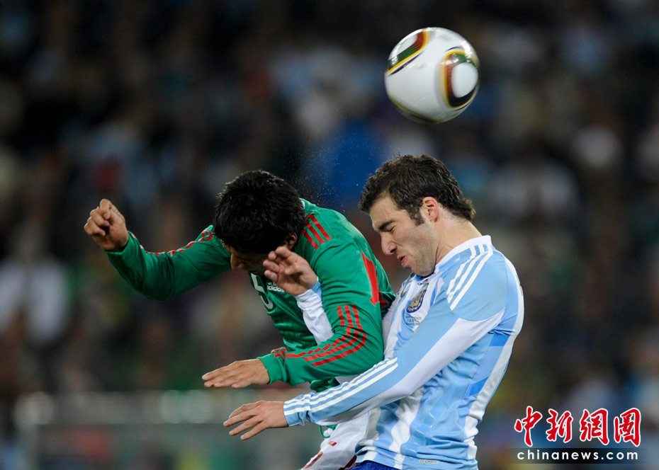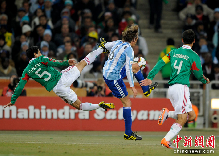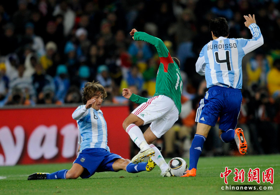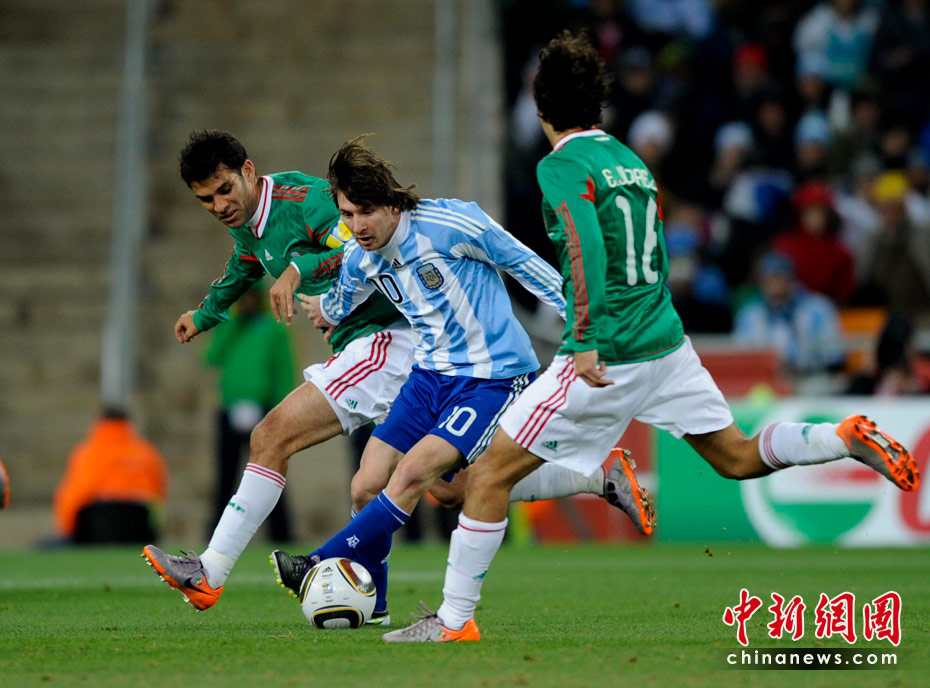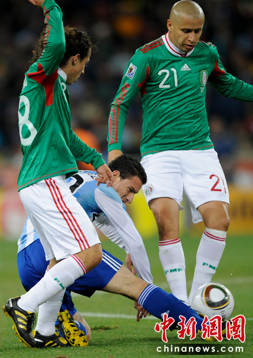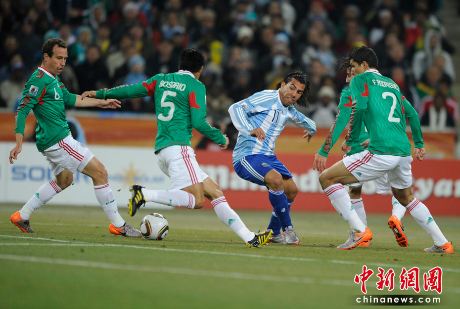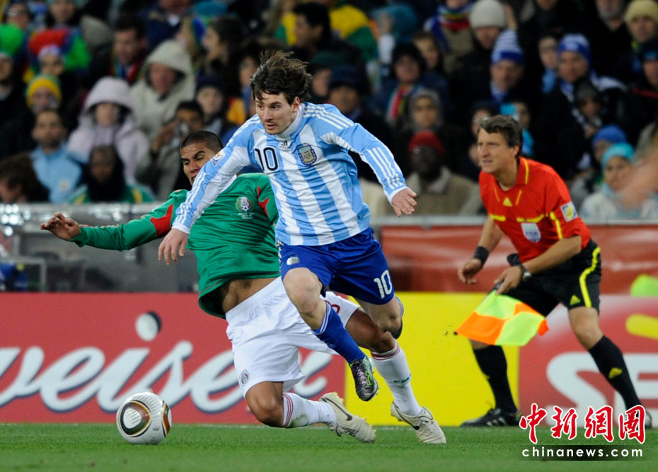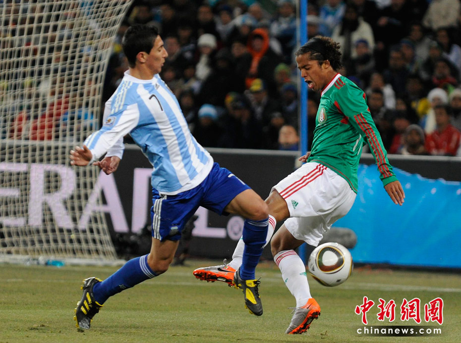 北京時間6月28日凌晨2:30,南非世界杯1/8決賽再賽一場,阿根廷隊在約翰內斯堡的足球城球場迎來了墨西哥隊。憑借特維斯一個明顯越位進球首開紀錄,隨后伊瓜因和特維斯各進一球,以3-1擊敗墨西哥,晉級八強。 中新社記者 廖攀 攝