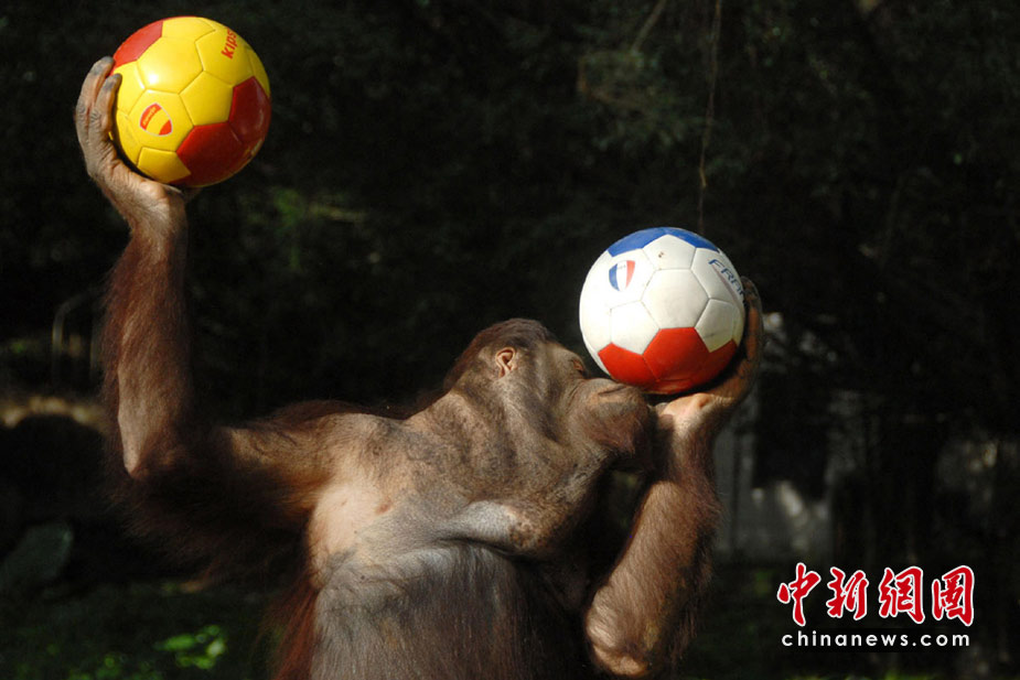 2010年南非世界杯六月底正在如火如荼地進(jìn)行,人們?cè)俅闻d起一輪熱愛(ài)足球的浪潮。居住在深圳野生動(dòng)物園里的動(dòng)物們也不甘落后,它們也紛紛玩起足球過(guò)把癮。中新社發(fā) 李木生 攝