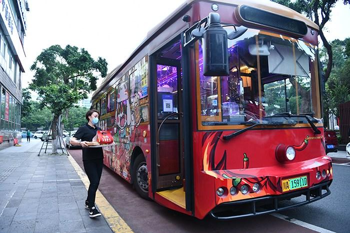 5月19日晚,一輛由公交車改成的火鍋巴士亮相成都春熙路,車上乘客可以一邊品嘗成都老火鍋,一邊欣賞成都夜色。火鍋巴士每日一班,行駛途經(jīng)望平街、339電視塔、天府廣場等成都著名景點。為確保行駛安全和疫情防控,火鍋巴士駕駛員通過專門培訓(xùn),速度全程控制在20公里/小時以內(nèi)。火鍋店直接提供煮好的菜品,車上不再生火。乘客也需要提前實名制預(yù)約憑綠碼上車,車廂僅提供8桌最多共16人用餐。圖為市民在火鍋巴士上體驗。 張浪 攝