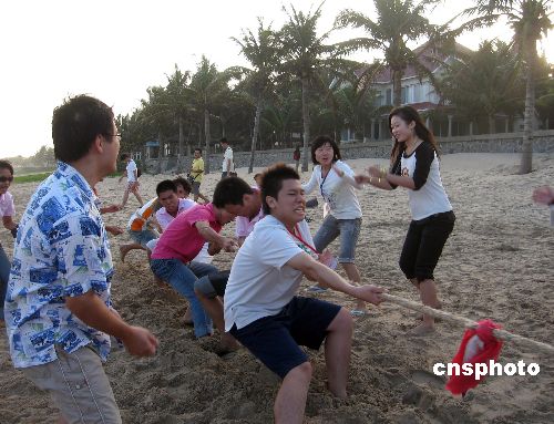 第二屆“歡聚海南大學(xué)”兩岸大學(xué)生冬令營11月13日舉行“深深相連”沙灘拔河比賽活動(dòng)。圖為臺(tái)灣學(xué)生奮力拔河,粉絲團(tuán)在旁邊吶喊助威。中新社發(fā) 彭小云 攝