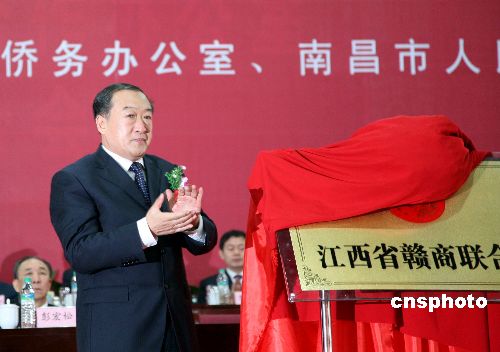 十八日,江西省舉辦首屆世界贛商論壇,近千名來自世界各地的贛籍商人出席盛會。圖為新任江西省委書記蘇榮為剛剛成立的江西省贛商聯合會揭牌。中新社發 吳慶才 攝