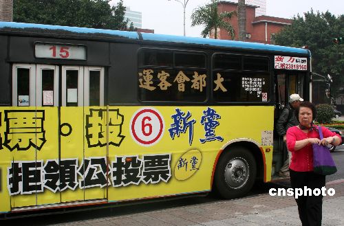 圖:臺(tái)公交車(chē)上刊登新黨“拒領(lǐng)公投票”廣告