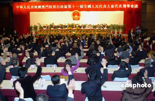 一月二十七日,澳門特區第十一屆全國人大代表選舉會議舉行全體會議,三百一十九名選舉會議成員投票選出十二名第十一屆全國人大代表。李沛霖、招銀英(女)、林笑云(女)、姚鴻明、高開賢、陸波、崔世平、梁玉華(女)、梁維特、賀一誠、劉焯華、劉藝良十二人當選第十一屆全國人民代表。圖為大會會場。中新社發 史利 攝