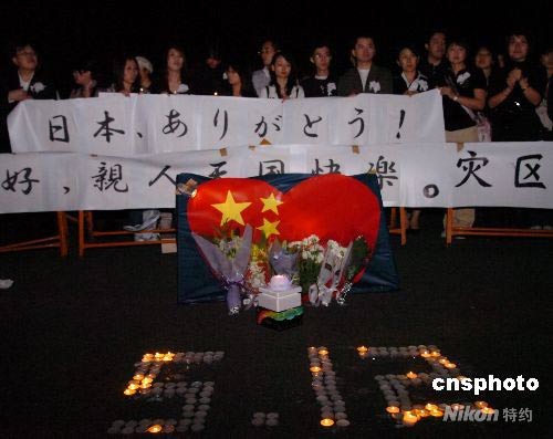 5月18日晚,150余位在日華人華僑和留學(xué)生自發(fā)來(lái)到東京市中心的新宿中央公園舉行燭光祈福活動(dòng),悼念5·12四川大地震遇難者。他們胸戴小白花、手持蠟燭,并打出“孩子一路走好”、“親人天國(guó)快樂(lè)”、“災(zāi)區(qū)人民挺住”等橫幅。中新社發(fā) 朱沿華 攝