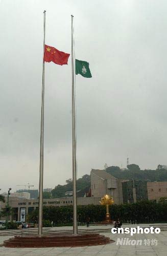 五月十九日八時整,澳門蓮花廣場降半旗,向四川大地震遇難同胞致哀。中新社發 史利 攝