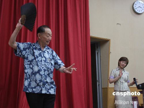 京劇大師梅蘭芳之子梅葆玖(左)第三次訪問臺灣,六月二十一日應邀在臺北科技大學演講時,應京劇戲迷要求表演《霸王別姬》片斷,其臺灣女弟子魏海敏(右)作陪并在一旁認真學習揣摩。中新社發 耿軍 攝