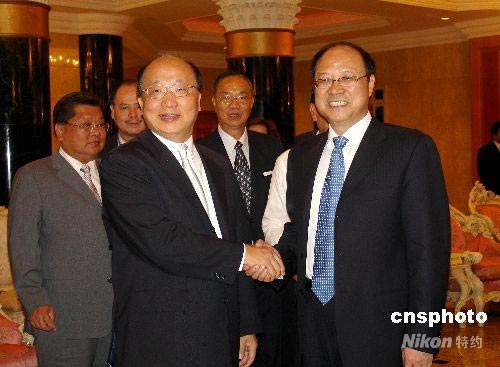 七月七日中午,中共中央臺辦、國臺辦常務副主任鄭立中(前右),在廈門親切會見搭乘周末包機從臺中首航廈門的臺中市市長胡志強(前左)一行。圖為兩人熱烈握手致意。中新社發 楊伏山 攝