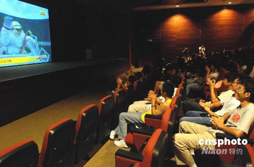 二十七日下午四時許,兩三百名澳門科技大學師生在學校禮堂收看“神舟七號”航天員出艙活動電視直播,不斷為中國航天員喝彩。中新社發 畢永光 攝