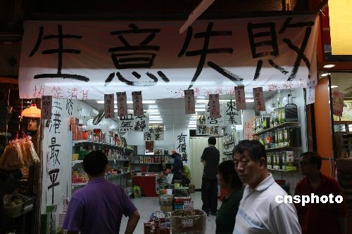 十一月二日,香港灣仔一店鋪打出結束營業、低價清盤的橫幅。數據表明,在剛剛過去的十月份,香港已有近五十家港企申請清盤,以主營制造業和零售業的中小企業為主,其中也不乏合俊、泰林等有一定規模和歷史的企業。業內人士認為,受金融海嘯直接影響而倒閉的公司將陸續出現,今年年底將迎來倒閉高潮。中新社發 武仲林 攝