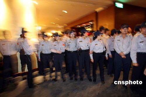 十一月五日晚,國民黨主席吳伯雄在臺(tái)北晶華酒店宴請海協(xié)會(huì)會(huì)長陳云林一行。警方重兵把守酒店外圍,有人士沖擊晚宴會(huì)場,在徒勞無功下與警方發(fā)生激烈推撞。中新社發(fā) 洪少葵 攝