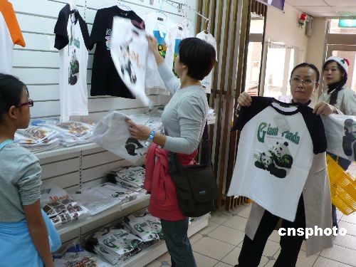 大陸贈臺大熊貓“團團”“圓圓”十二月二十三日晚間抵達臺北市立動物園。動物園內紀念品商店里的大熊貓相關商品進貨數量激增,民眾購買熱情高漲。圖為臺灣民眾在選購印有大熊貓圖案的T恤衫。中新社發 路梅 攝